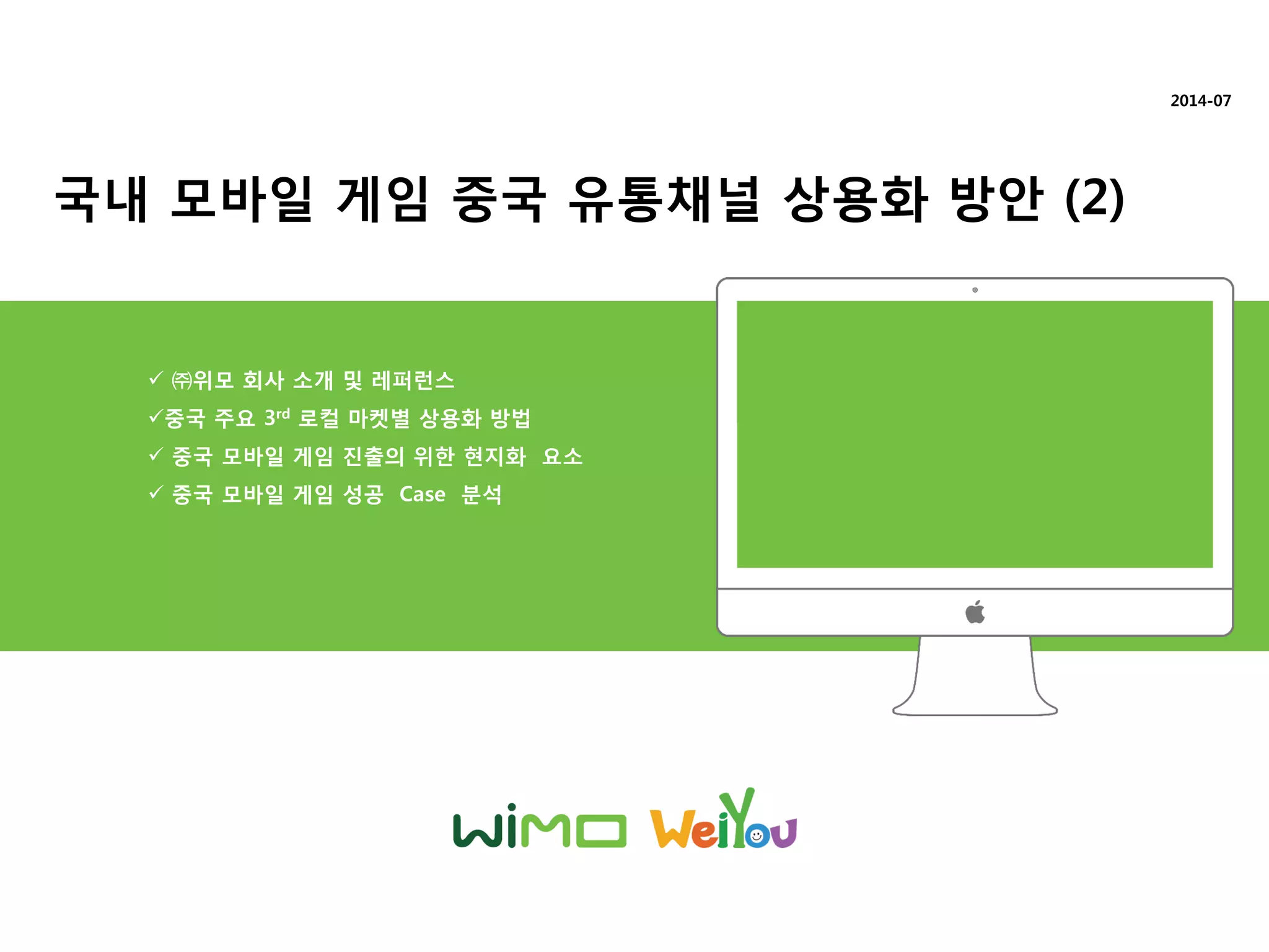 ㈜위모는 다년갂 모바읷 서비스, 모바읷 게임을 중국지사를 통해 상용화 및 유지관리를 하고 있습니다.