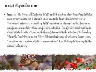 • โครงงาน คือกิจกรรมที่เปิดโอกาสให้ ผู้เรียนได้ทาการศึกษาค้นคว้าและฝึกปฏิบัติด้วย