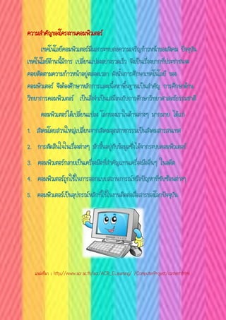เทคโนโลยีด้านนี้มีการ เปลี่ยนแปลงอย่างรวดเร็ว จึงเป็นเรื่องยากที่ประชาชนจะ คอยติดตามความก้าวหน้าอยู่ตลอดเวลา ดังนั้นการศึกษาเทคโนโลยี ของ คอมพิวเตอร์ จึงต้องศึกษาหลักการและเนื้อหาพื้นฐานเป็นสาคัญ การศึกษาด้าน วิทยาการคอมพิวเตอร์ เป็นสิ่งจาเป็นเสมือนกับการศึกษาวิทยาศาสตร์ธรรมชาติ คอมพิวเตอร์ได้เปลี่ยนแปลง โลกของเราในด้านต่างๆ มากมาย ได้แก่ 1. สังคมโดยส่วนใหญ่เปลี่ยนจากสังคมอุตสาหกรรมเป็นสังคมสารสนเทศ 2. การตัดสินใจในเรื่องต่างๆ มักขึ้นอยู่กับข้อมูลซึ่งได้จากระบบคอมพิวเตอร์ 3. คอมพิวเตอร์กลายเป็นเครื่องมือที่สาคัญแทนเครื่องมืออื่นๆ ในอดีต 4. คอมพิวเตอร์ถูกใช้ในการออกแบบสถานการณ์หรือปัญหาที่ซับซ้อนต่างๆ 5. คอมพิวเตอร์เป็นอุปกรณ์หลักที่ใช้ในงานติดต่อสื่อสารของโลกปัจจุบัน แหล่งที่มา : http://www.acr.ac.th/acr/ACR_ELearning/ /ComputerProject/content1.html