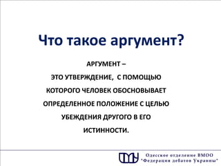 Документ описывает структуру аргумента и дает рекомендации по формулированию тезисов и поддерживающих элементов. Включены указания на виды аргументов, их характеристики и критерии оценки, а также примеры. Также обсуждаются практические аспекты убеждения и необходимость логической связи между элементами аргумента.