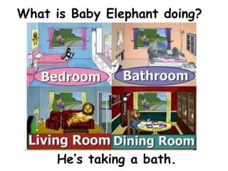 The document describes the locations and statuses of various animals and objects. Mr. Lion is in the living room and on the bed, where he is sleepy and cold. Baby Elephant is taking a bath. There are 3 candies in the desk, the dog is under the chair, the frog is in the box, and the cows are eating. There are four teddy bears.