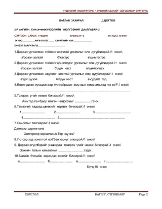 ЭРДМИЙН ДАЛАЙ” ЦОГЦОЛБОР СУРГУУЛЬ БАТЛАВ ЗАХИРАЛ Д.ЦОГТОО 2-Р АНГИЙН ХҮН ОРЧИНХИЧЭЭЛИЙН ҮНЭЛГЭЭНИЙ ДААЛГАВАР-2 СЭРГЭЭН САНАХ ТҮВШИН ХУВИЛБАР- Б ХУГАЦАА-40 МИН ОГНОО.....................АНГИ БҮЛЭГ......... СУРАГЧИЙН НЭР............................... ХИЧЭЭЛ ЗААГЧ БАГШ............................................. 1.Дараах ургамлаас гоёмсог навчтай ургамлыг олж дугуйлаарай.1 оноо аэрээн халгай бкактус вшимтэглээ 2.Дараах ургамлаас гоёмсог цэцэглэдэг ургамлыг олж дугуйлаарай.1 оноо аэрээн халгай бзуун наст вшимтэглээ 3.Дараах ургамлаас шүүслэг навчтай ургамлыг олж дугуйлаарай.1 оноо ацэгцүүхэй бзуун наст всудалт тод 4.Өвөл удаан хугацаагаар гүн нойрсдог амьтдыг ямар амьтад гэх вэ?1 оноо ............................................................................................................................ 5.Тохирох үгийг нөхөж бичээрэй.1 оноо Амьтад гүн буюу хөнгөн нойрсохыг ....................гэнэ. 6.Тэмээний гадаад шинжийг нэрлэж бичээрэй.1 оноо 1............................ 2............................ 3.......................................... 4..................................... 5........................................................................... 7.Оньсогыг таагаарай 1 оноо Дэнжээр дэржигнэнэ Хотгороор хоржигноно.Тэр юу вэ? 8.7-р сар хэд хоногтой вэ?Зөв хариуг олоорой.1 оноо 9. Дараах өгүүлбэрийг уншихдаа тохирох үгийг нөхөж бичээрэй.1 оноо Ээжийн талын хамаатныг ..............................гэдэг. 10.Биеийн бүтцийн харагдах хэсгийг бичээрэй.1 оноо а.............................. б........................... в........................... г............................. ... Бүгд 10 оноо ХӨВСГӨЛ БАГШ Г. ОТГОНБАЯР Page 2