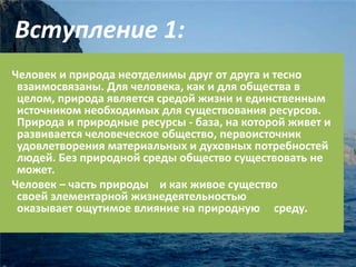 Документ рассматривает взаимосвязь человека и природы в контексте мировой и отечественной литературы, подчеркивая их неразрывность и влияние на развитие личности. В нем освещены работы известных авторов, которые описывают как harmonny, так и конфликтные отношения человека с природой, акцентируя внимание на моральных, социальных и этических аспектах этих взаимодействий. Также представлены примеры из произведений писателей, таких как Тургенев и Хемингуэй, где природа играет ключевую роль в формировании человеческой судьбы и сознания.