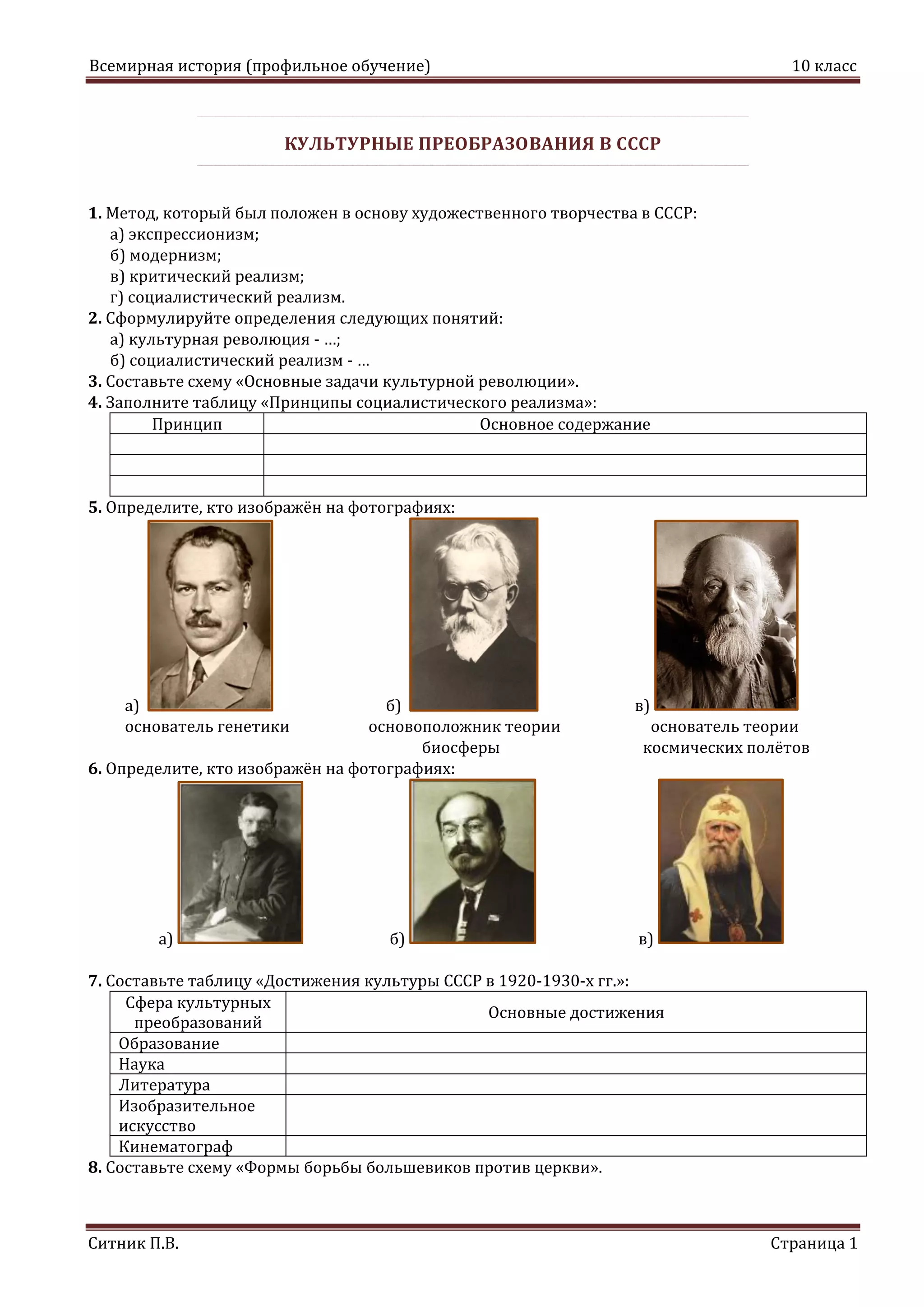 Документ представляет собой учебный материал по всемирной истории для 10 класса, посвященный культурным преобразованиям в СССР. Он включает методологические основы художественного творчества, определения ключевых понятий и задания на составление схем и таблиц, охватывающих основные достижения культуры и формы борьбы большевиков. Ученикам предлагается изучить социалистический реализм и его принципы, а также исследовать культурную революцию и её задачи.