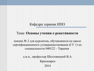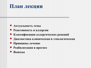 Документ представляет собой лекцию по основам учения о реактивности для курсантов, обучающихся в области терапии. Основное внимание уделяется реактивности, аллергии, их классификации, диагностическим методам и принципам лечения. Лекция также охватывает актуальность аллергических заболеваний, их патогенез и терапевтические подходы.