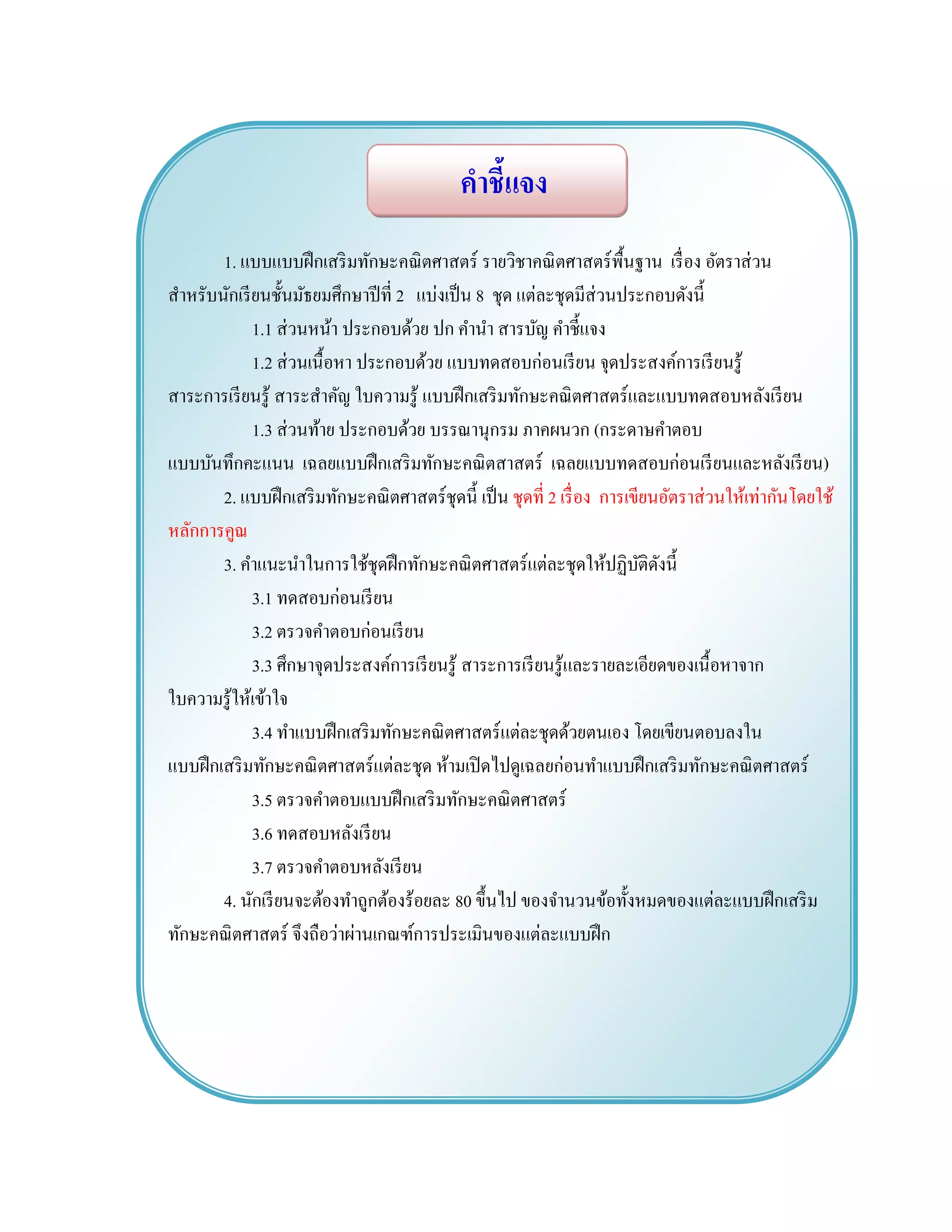 รายวิชาคณิตศาสตร์พื้นฐาน เรื่อง อัตราส่วน สาหรับนักเรียนชั้นมัธยมศึกษาปีที่ 2 แบ่งเป็น 8 ชุด แต่ละชุดมีส่วนประกอบดังนี้ 1.1 ส่วนหน้า ประกอบด้วย ปก คานา สารบัญ คาชี้แจง 1.2 ส่วนเนื้อหา ประกอบด้วย แบบทดสอบก่อนเรียน จุดประสงค์การเรียนรู้ สาระการเรียนรู้ สาระสาคัญ ใบความรู้ แบบฝึกเสริมทักษะคณิตศาสตร์และแบบทดสอบหลังเรียน 1.3 ส่วนท้าย ประกอบด้วย บรรณานุกรม ภาคผนวก (กระดาษคาตอบ แบบบันทึกคะแนน เฉลยแบบฝึกเสริมทักษะคณิตสาสตร์ เฉลยแบบทดสอบก่อนเรียนและหลังเรียน) 2. แบบฝึกเสริมทักษะคณิตศาสตร์ชุดนี้ เป็น ชุดที่ 2 เรื่อง การเขียนอัตราส่วนให้เท่ากันโดยใช้ หลักการคูณ 3. คาแนะนาในการใช้ชุดฝึกทักษะคณิตศาสตร์แต่ละชุดให้ปฏิบัติดังนี้ 3.1 ทดสอบก่อนเรียน 3.2 ตรวจคาตอบก่อนเรียน 3.3 ศึกษาจุดประสงค์การเรียนรู้ สาระการเรียนรู้และรายละเอียดของเนื้อหาจาก ใบความรู้ให้เข้าใจ 3.4 ทาแบบฝึกเสริมทักษะคณิตศาสตร์แต่ละชุดด้วยตนเอง โดยเขียนตอบลงใน แบบฝึกเสริมทักษะคณิตศาสตร์แต่ละชุด ห้ามเปิดไปดูเฉลยก่อนทาแบบฝึกเสริมทักษะคณิตศาสตร์ 3.5 ตรวจคาตอบแบบฝึกเสริมทักษะคณิตศาสตร์ 3.6 ทดสอบหลังเรียน 3.7 ตรวจคาตอบหลังเรียน 4. นักเรียนจะต้องทาถูกต้องร้อยละ 80 ขึ้นไป ของจานวนข้อทั้งหมดของแต่ละแบบฝึกเสริม ทักษะคณิตศาสตร์ จึงถือว่าผ่านเกณฑ์การประเมินของแต่ละแบบฝึก
