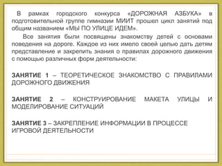 В гимназии МИИТ реализован проект «Мы по улице идем» в рамках конкурса «Дорожная азбука», направленный на ознакомление детей с правилами дорожного движения. Проект включал теоретические занятия, конструирование макета улицы и игровые актировки, где дети изучали и отрабатывали основы безопасного поведения на дороге. В рамках занятий ребята освоили важные правила, такие как использование светофоров и пешеходных переходов.