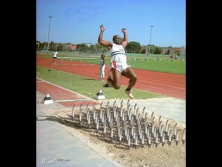 The document summarizes common injuries in track and field athletes. It discusses overuse injuries that occur during training like muscle strains, as well as acute injuries like stress fractures. It also covers potentially life-threatening issues like sudden cardiac death. The document includes photos of different track and field events and injuries related to sprinting, hurdles, long distance running, jumping events and throwing events. It discusses treatments and prevention of track and field injuries.