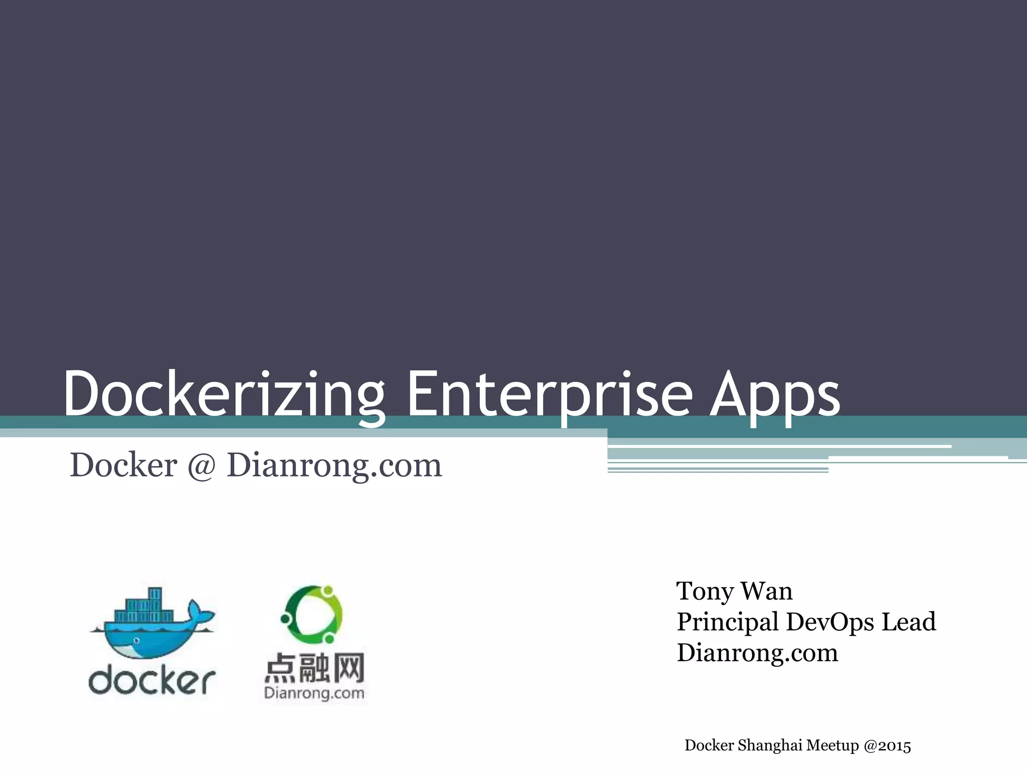 This document discusses Dockerizing enterprise applications at Dianrong.com. It begins with an introduction of the speaker and agenda. It then provides a quick introduction to Docker and discusses why Docker was chosen, including requirements for resource sharing, simplified configuration, on-demand deployment, and security. Details are given on how Dianrong.com apps like NodeJS, Oracle, MongoDB, Redis, and MySQL have been Dockerized. Lessons learned include best practices around volumes, environment variables, image size, and known limitations of Docker.