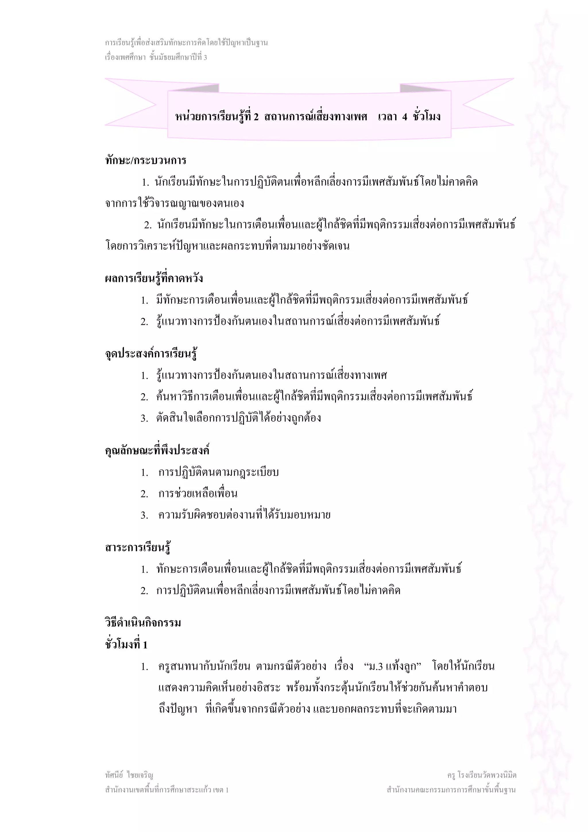 หนวยการเรียนรูที่ 2 สถานการณเสี่ยงทางเพศ เวลา 4 ชั่วโมง ทักษะ/กระบวนการ 1. นักเรียนมีทกษะในการปฏิบัตตนเพื่อหลีกเลี่ยงการมีเพศสัมพันธโดยไมคาดคิด ั ิ จากการใชวิจารณญาณของตนเอง 2. นักเรียนมีทกษะในการเตือนเพื่อนและผูใกลชิดที่มีพฤติกรรมเสี่ยงตอการมีเพศสัมพันธ ั โดยการวิเคราะหปญหาและผลกระทบที่ตามมาอยางชัดเจน ผลการเรียนรูที่คาดหวัง 1. มีทักษะการเตือนเพื่อนและผูใกลชิดทีมีพฤติกรรมเสี่ยงตอการมีเพศสัมพันธ ่ 2. รูแนวทางการปองกันตนเองในสถานการณเสี่ยงตอการมีเพศสัมพันธ จุดประสงคการเรียนรู 1. รูแนวทางการปองกันตนเองในสถานการณเสี่ยงทางเพศ 2. คนหาวิธีการเตือนเพื่อนและผูใกลชิดที่มีพฤติกรรมเสี่ยงตอการมีเพศสัมพันธ 3. ตัดสินใจเลือกการปฏิบัติไดอยางถูกตอง คุณลักษณะที่พึงประสงค 1. การปฏิบัติตนตามกฎระเบียบ 2. การชวยเหลือเพื่อน 3. ความรับผิดชอบตองานที่ไดรับมอบหมาย สาระการเรียนรู 1. ทักษะการเตือนเพื่อนและผูใกลชิดที่มพฤติกรรมเสี่ยงตอการมีเพศสัมพันธ ี 2. การปฏิบัติตนเพื่อหลีกเลี่ยงการมีเพศสัมพันธโดยไมคาดคิด วิธีดําเนินกิจกรรม ชั่วโมงที่ 1 1. ครูสนทนากับนักเรียน ตามกรณีตวอยาง เรื่อง “ม.3 แทงลูก” โดยใหนกเรียน ั ั แสดงความคิดเห็นอยางอิสระ พรอมทั้งกระตุนนักเรียนใหชวยกันคนหาคําตอบ ถึงปญหา ที่เกิดขึ้นจากกรณีตวอยาง และบอกผลกระทบที่จะเกิดตามมา ั ทัศนีย ไชยเจริญ ครู โรงเรียนวัดพวงนิมิต สํานักงานเขตพื้นที่การศึกษาสระแกว เขต 1 สํานักงานคณะกรรมการการศึกษาขั้นพื้นฐาน