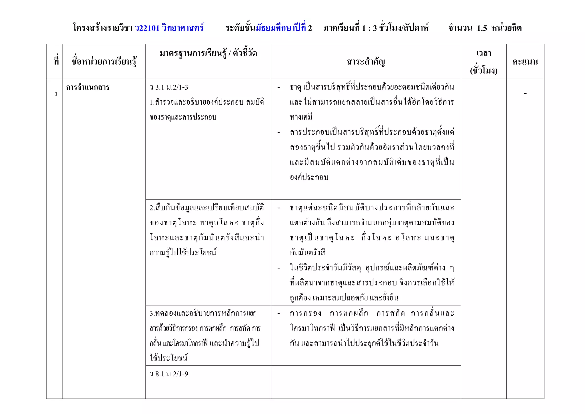 โครงสรางรายวิชา ว22101 วิทยาศาสตร ระดับชั้นมัธยมศึกษาปที่ 2 ภาคเรียนที่ 1 : 3 ชั่วโมง/สัปดาห จํานวน 1.5 หนวยกิต