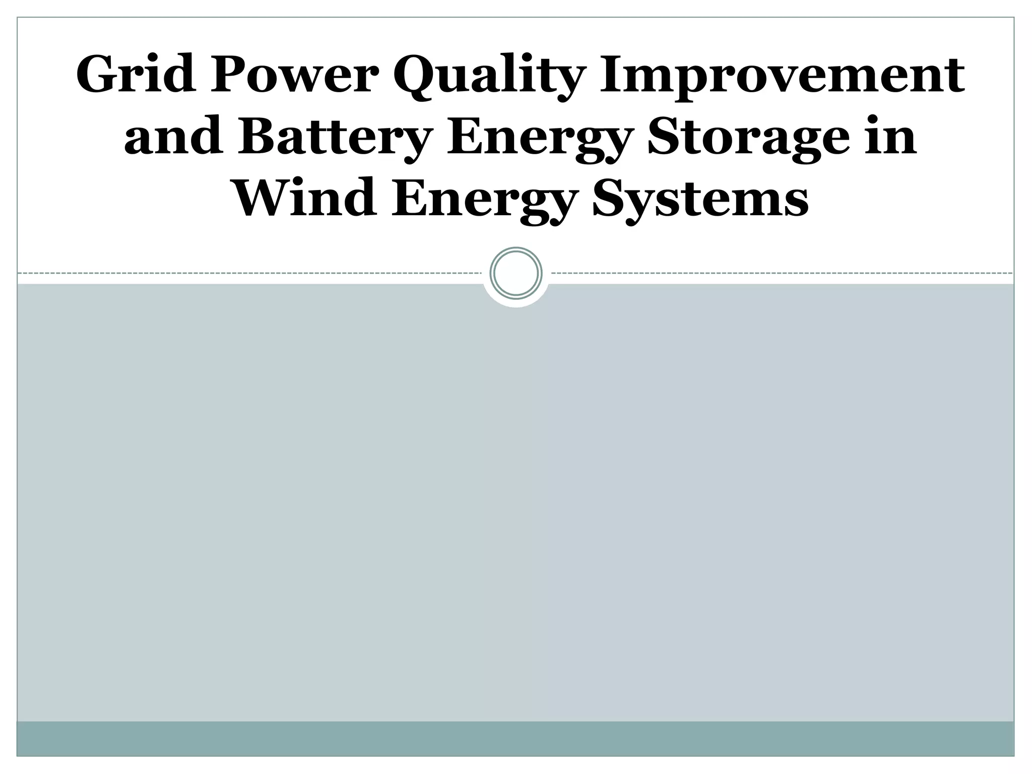 This document proposes using a static compensator (STATCOM) connected to a battery energy storage system (BESS) to mitigate power quality issues from wind energy generation. Wind power fluctuates due to changing wind speed, which affects power quality. The STATCOM injects reactive power from the BESS to absorb harmonic current and regulate voltage. This improves power quality by making the source current harmonic-free and stabilizing the system voltage. The combination of BESS and STATCOM helps compensate for wind power fluctuations and produces higher quality power from the wind generation system.