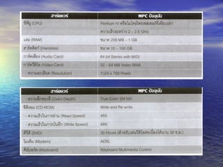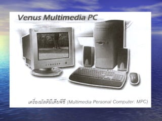มัลติมีเดียพีซี ( MultimediaPersonal Computer) มีองค์ประกอบหลัก 5 ส่วน ดังนี้ 1. เครื่องพีซี ( Personal Computer) 2. เครื่องอ่านซีดีรอม ( CD-ROM Drive) มี Average Seek Time และ Data Transfer Rate 3. ซาวนด์การ์ด ( Sound Card หรือ Sound Board) 4. ลำโพงภายนอก ( External Speaker) 5. ซอฟต์แวร์ประยุกต์ ( Application Software) - 15.