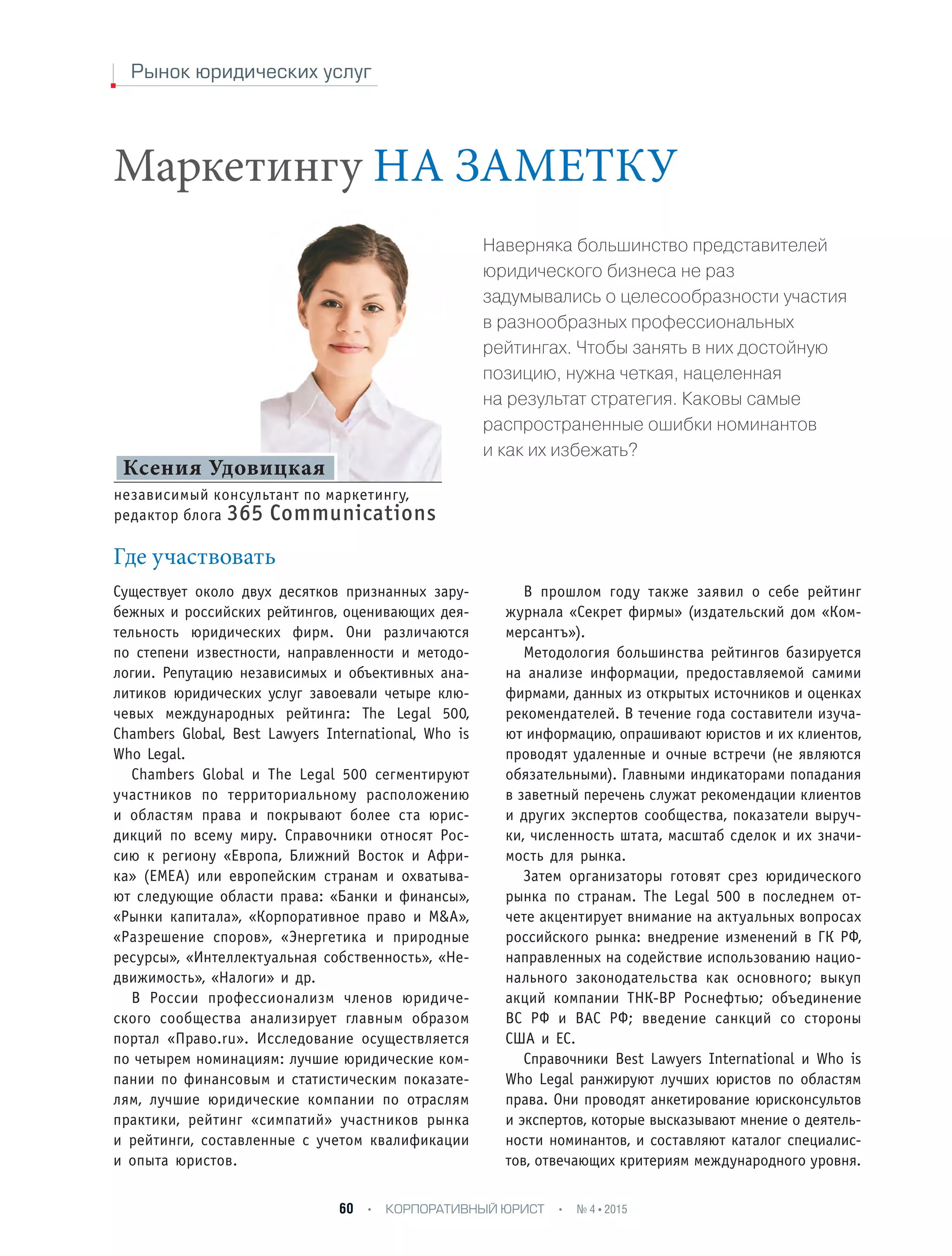 Документ обсуждает важность участия юридических фирм в профессиональных рейтингах и описывает распространенные ошибки, которые следует избегать. Участвовать в таких рейтингах помогает повысить имидж фирмы, структурировать информацию о ее работе и расширить клиентскую базу. Обозначены ключевые международные рейтинги и даны рекомендации по подготовке заявочной документации для успешного участия.