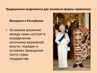 Документ описывает формы государственного правления, выделяя две основные: монархию и республику. Монархия делится на абсолютную, дуалистическую и парламентарную, в то время как республика может быть президентской или парламентской; каждая форма имеет свои уникальные характеристики и механизмы власти. Также рассматриваются унитарное и федеративное государственное устройство, с акцентом на взаимосвязи между центральными и региональными органами власти.