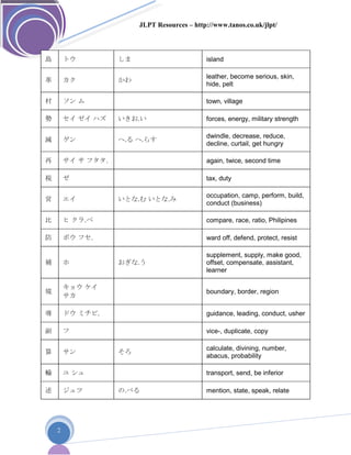 http://www.tanos.co.uk/jlpt/ 1 JLPT N2 Kanji List This is not a cumulative list. (It doesn't contain the kanji needed by JLPT N3 and below). Kanji Onyomi Kunyomi English 党 トウ なかま むら party, faction, clique 協 キョウ co-, cooperation 総 ソウ フ す.べて すべ.て general, whole, all, full, total 区 ク オウ コウ ward, district 領 リョウ jurisdiction, dominion, territory, fief, reign 県 ケン カ.ケ prefecture 設 セツ モウ.ケ establishment, provision, prepare 改 カイ あらた.める あらた.まる reformation, change, modify, mend, renew, examine, inspect, search 府 borough, urban prefecture, govt office, representative body, storehouse 査 サ investigate 委 イ ユダ.ネ committee, entrust to, leave to, devote, discard 軍 グン army, force, troops, war, battle 団 ダン トン かたまり まる.い group, association 各 カク オノオ each, every, either