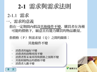 文档讨论了需求与供给的基本概念、法则及其影响因素。需求的变化受消费者偏好、所得、相关物品价格等多因素影响,而供给则与生产成本、生产者的数量和政策等有关。需求与供给之间的相互作用决定了市场价格和交易量的变化。
