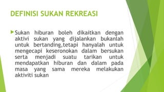 Sukan rekreasi adalah aktiviti sukan yang dilakukan untuk keseronokan dan bukan untuk bertanding. Ia meliputi sukan seperti paintball, wall climbing dan bungee jumping. Sukan-sukan ini memberikan manfaat seperti mengurangkan stres dan mengeratkan hubungan sosial. Laporan ini menganjurkan agar lebih banyak sukan rekreasi dikembangkan untuk menarik minat pelbagai golongan masyarakat.