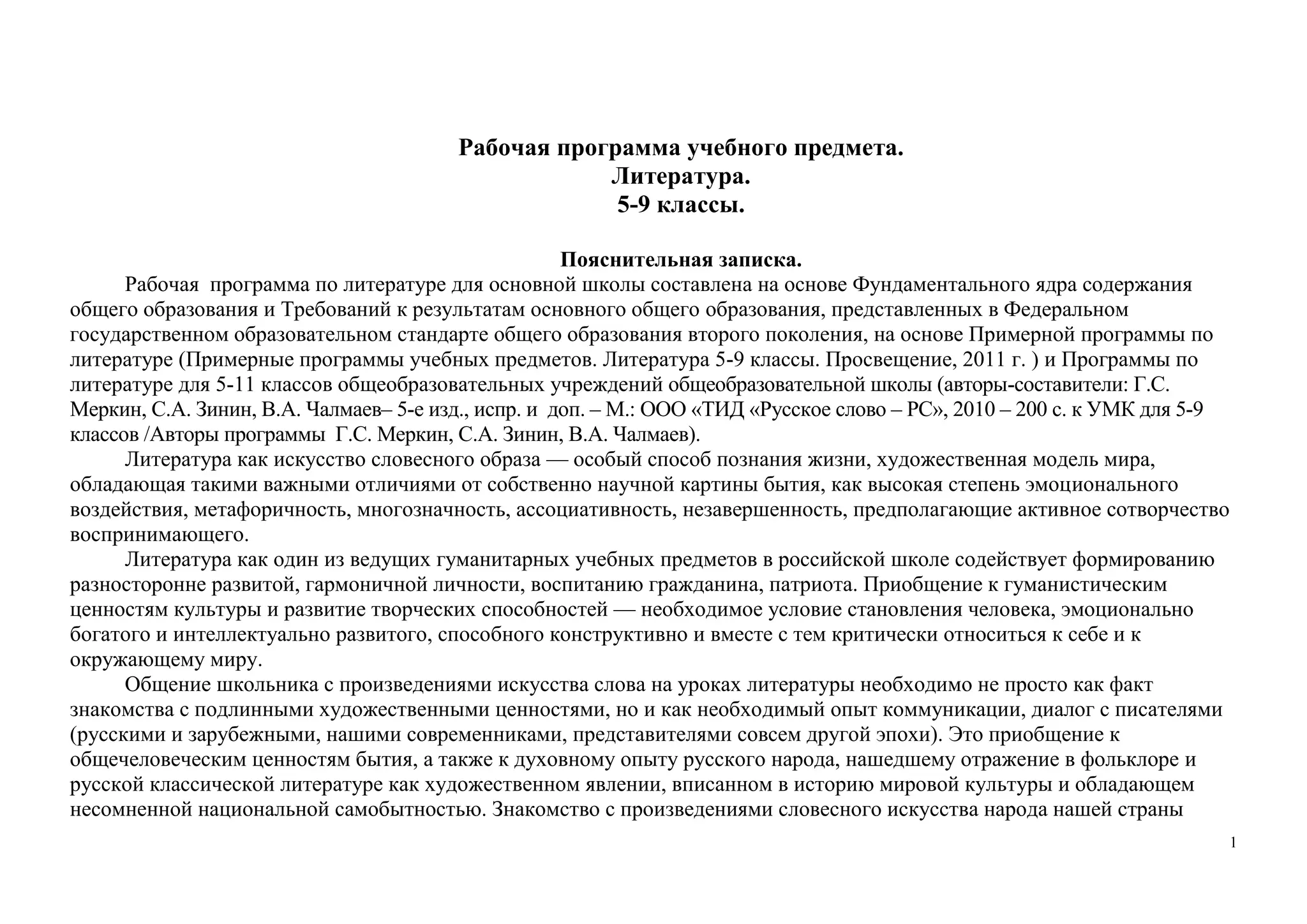 Рабочая программа по литературе для 5-9 классов основывается на федеральных стандартах образования и примерной программе, направленной на развитие творческих способностей учеников и формирование гуманистических ценностей. Учебный предмет 'литература' способствует углубленному пониманию культурных и нравственных аспектов через чтение и анализ художественных произведений. Основные цели курса включают развитие личности, критического мышления и речевых навыков, а также знакомство с богатством русской и мировой литературы.