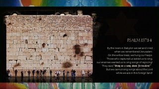 詩篇137篇 1.我們曾在巴比倫的河邊坐下,一追想錫安就哭了。 2.我們把琴掛在那裡的柳樹上; 3.因為在那裡,擄掠我們的要我們唱歌,搶奪我們的要我們作樂,說: 給我們唱一首錫安歌吧! 4.我們怎能在外邦唱耶和華的歌呢? 5.耶路撒冷啊,我若忘記你,情願我的右手忘記技巧! 6.我若不記念你,若不看耶路撒冷過於我所最喜樂的,情願我的舌頭 貼於上膛! 7.耶路撒冷遭難的日子,以東人說:拆毀! 拆毀!直拆到根基!耶和華啊,求你記念 這仇! 8.將要被滅的巴比倫城啊(城:原文是女子),報復你像你待我們的, 那人便為有福! 9.拿你的嬰孩摔在磐石上的,那人便為有福!