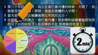 覺醒… awakening 此刻我最深的感受是? 神啊,我本周可怎樣看現處的光境? 1 第三十年四月五日,我正在迦巴魯河邊 的時候,天開了,我就看見神的異象; 那時,我是在被擄的人中間。 2 當天是約雅斤王被擄後第五年四月五日。 3