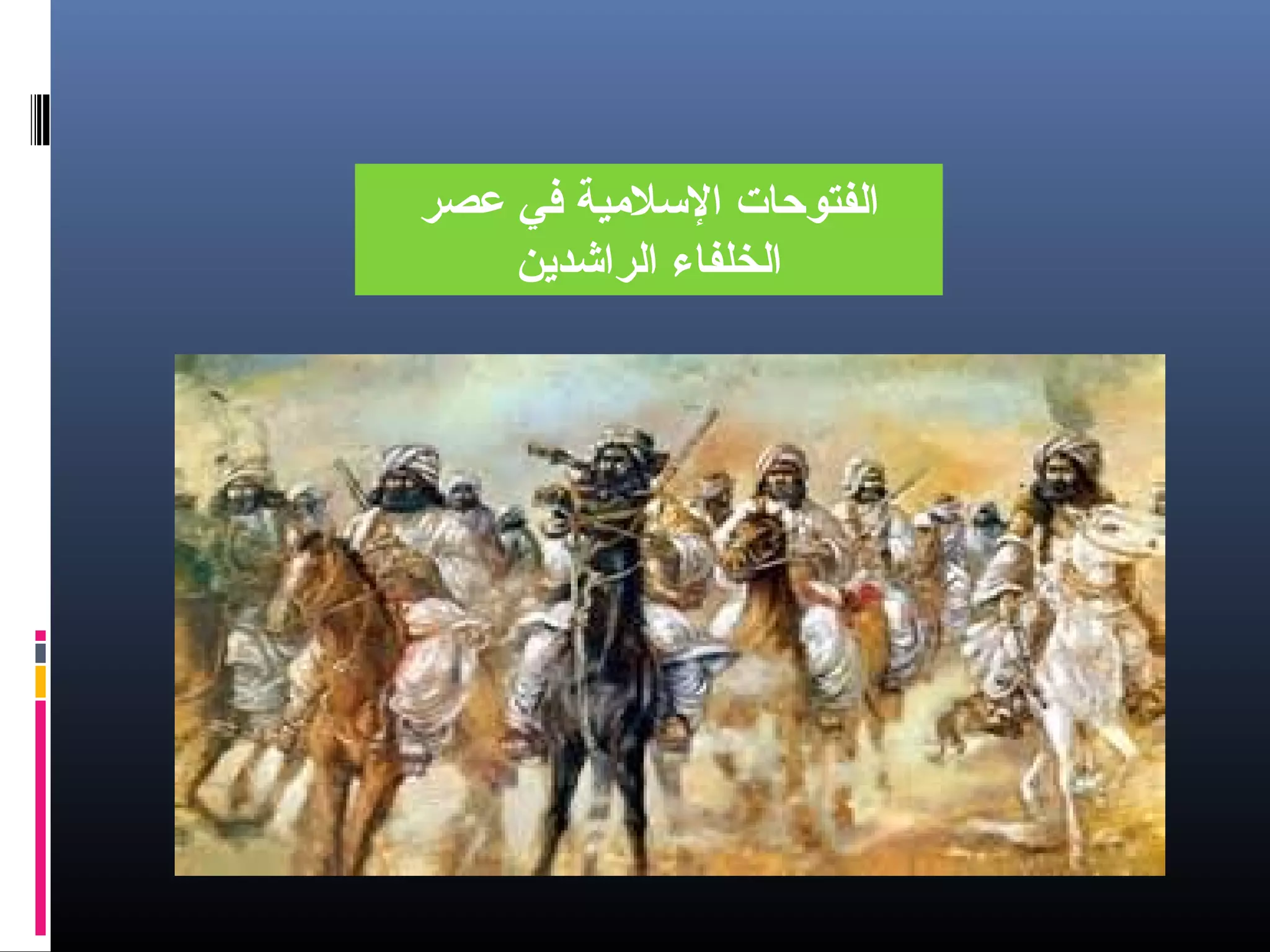تتناول الوثيقة الفتوحات الإسلامية خلال عصر الخلفاء الراشدين، مركّزةً على أهمية هذه الفترة في تشكيل الحضارة الإسلامية واستراتيجيات الحروب مع الفرس والعراق. توضح الوثيقة الأحداث العسكرية الرئيسية والمعارك التي خاضها المسلمون لفتح البلدان المختلفة، مما أدى إلى توسيع رقعة الدولة الإسلامية بشكل كبير. كما تبرز دور الخلفاء مثل أبو بكر وعمر بن الخطاب في تنظيم الحملات العسكرية وتوجيه الجيوش.
