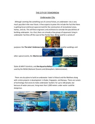 The document proposes guidelines for a better future city, including considerations for security, sustainable water resources, geographic suitability, sewerage systems, economic importance, cultural hubs, healthcare, education, and green living. Key elements are 24/7 surveillance, adequate police presence, regulated neighborhood entry, water distribution and treatment systems, storm drainage and waste management, protection from climate dangers, economically stable government, sufficient religious sites and hospitals, schools from kindergarten through university, and pollution control laws.
