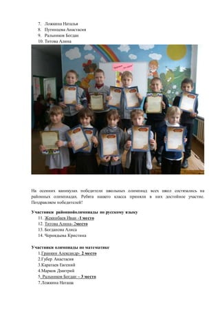 В Тогульской средней школе прошли школьные олимпиады, в которых активно участвовал 2а класс, с хорошими результатами по русскому языку, математике, окружающему миру и чтению. Участники имели возможность представить свои достижения на районных олимпиадах, и многие из них стали призерами. Также в школе прошла неделя литературного чтения с различными конкурсами и мероприятиями, способствующими развитию литературного интереса у учащихся.