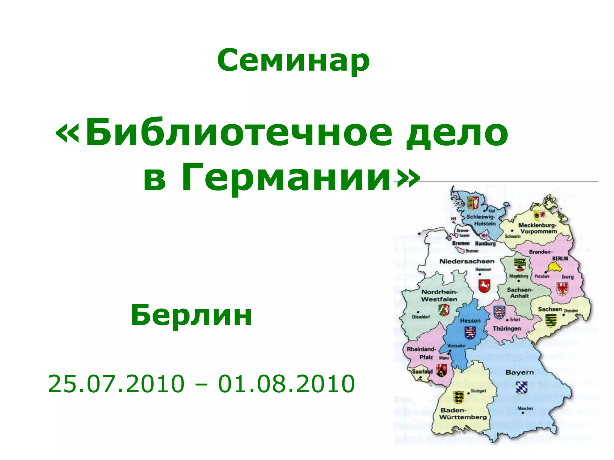 Документ описывает семинар по библиотечному делу в Германии, который проходил с 25 июля по 1 августа 2010 года. Основное внимание уделяется отсутствию национального закона о библиотеках и министерства культуры, а также вопросам профессиональной подготовки библиотекарей и тенденциям в развитии детских и юношеских библиотек. Обсуждаются также направления работы государственных библиотек и проекты, направленные на цифровизацию и культурное сотрудничество.