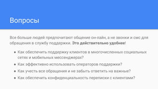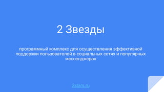 Документ представляет программный комплекс 2звезды, который обеспечивает эффективную поддержку пользователей в социальных сетях и мессенджерах. Он автоматически обрабатывает обращения, назначая их операторам и сохраняя переписку в облачной базе данных Microsoft Azure с учетом конфиденциальности. Основные концепции проекта включают порядок, эффективность и омниканальную поддержку через различные платформы.