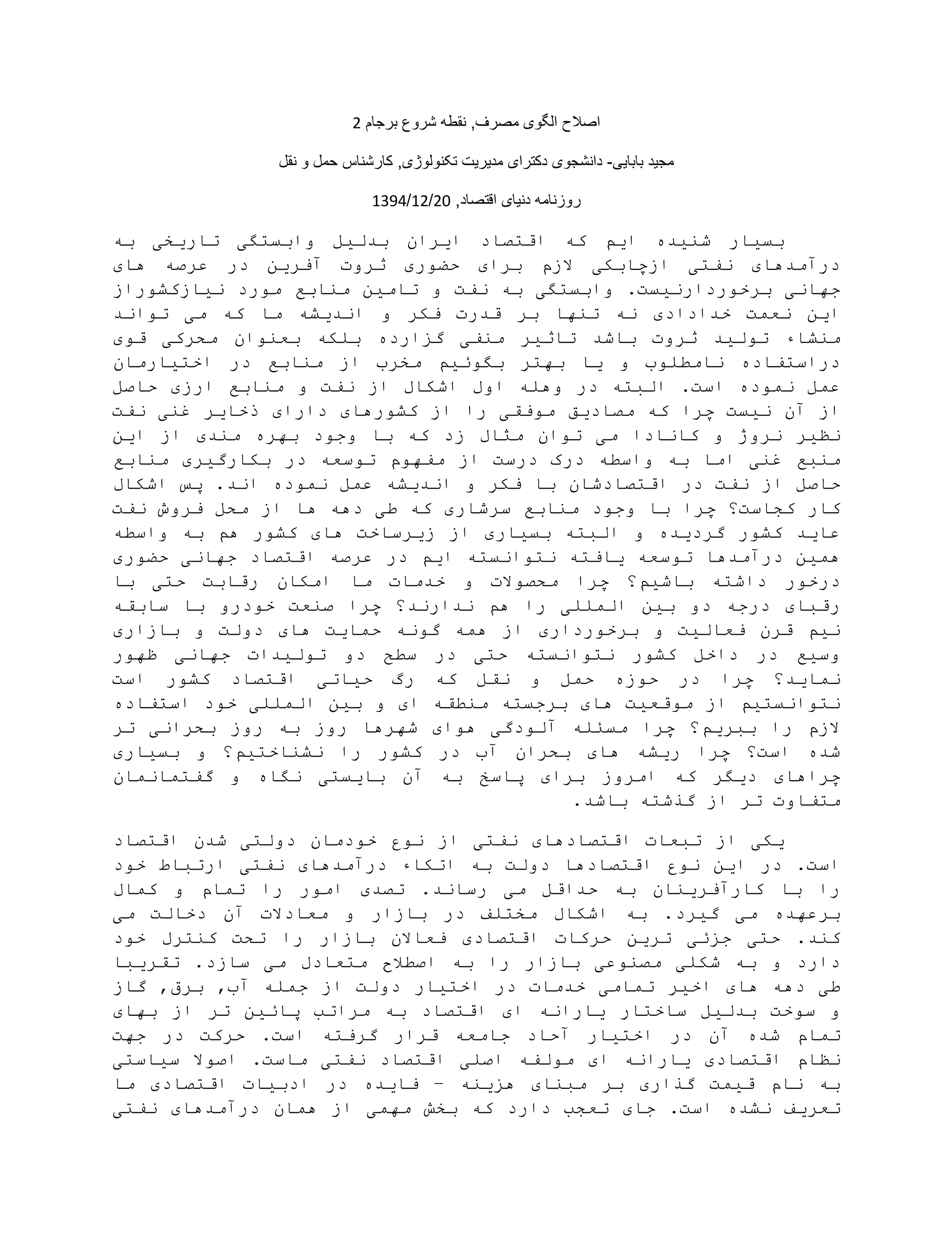 اﺻﻼحاﻟﮕویﻣﺻرف,ﻧﻘطﮫﺷروعﺑرﺟﺎم2 ﻣﺟﯾدﺑﺎﺑﺎﯾﯽ-داﻧﺷﺟویدﮐﺗرایﻣدﯾرﯾتﺗﮑﻧوﻟوژی,ﮐﺎرﺷﻧﺎسﺣﻣلوﻧﻘل روزﻧﺎﻣﮫدﻧﯾﺎیاﻗﺗﺻﺎد,20/12/1394 ﺑﺴﯿﺎرﺷﻨﯿﺪهاﯾﻢﮐﮫاﻗﺘﺼﺎداﯾﺮانﺑﺪﻟﯿﻞواﺑﺴﺘﮕﯽﺗﺎرﯾﺨﯽﺑﮫ درآﻣﺪھﺎیﻧﻔﺘﯽازﭼﺎﺑﮑﯽﻻزمﺑﺮایﺣﻀﻮریﺛﺮوتآﻓﺮﯾﻦدرﻋﺮﺻﮫھﺎی ﺟﮭﺎﻧﯽﺑﺮﺧﻮردارﻧﯿﺴﺖ.واﺑﺴﺘﮕﯽﺑﮫﻧﻔﺖوﺗﺎﻣﯿﻦﻣﻨﺎﺑﻊﻣﻮردﻧﯿﺎزﮐﺸﻮراز اﯾﻦﻧﻌﻤﺖﺧﺪادادیﻧﮫﺗﻨﮭﺎﺑﺮﻗﺪرتﻓﮑﺮواﻧﺪﯾﺸﮫﻣﺎﮐﮫﻣﯽﺗﻮاﻧﺪ ﻣﻨﺸﺎءﺗﻮﻟﯿﺪﺛﺮوتﺑﺎﺷﺪﺗﺎﺛﯿﺮﻣﻨﻔﯽﮔﺰاردهﺑﻠﮑﮫﺑﻌﻨﻮانﻣﺤﺮﮐﯽﻗﻮی دراﺳﺘﻔﺎدهﻧﺎﻣﻄﻠﻮبوﯾﺎﺑﮭﺘﺮﺑﮕﻮﺋﯿﻢﻣﺨﺮبازﻣﻨﺎﺑﻊدراﺧﺘﯿﺎرﻣﺎن ﻋﻤﻞﻧﻤﻮدهاﺳﺖ.اﻟﺒﺘﮫدروھﻠﮫاولاﺷﮑﺎلازﻧﻔﺖوﻣﻨﺎﺑﻊارزیﺣﺎﺻﻞ ازآنﻧﯿﺴﺖﭼﺮاﮐﮫﻣﺼﺎدﯾﻖﻣﻮﻓﻘﯽراازﮐﺸﻮرھﺎیدارایذﺧﺎﯾﺮﻏﻨﯽﻧﻔﺖ ﻧﻈﯿﺮﻧﺮوژوﮐﺎﻧﺎداﻣﯽﺗﻮانﻣﺜﺎلزدﮐﮫﺑﺎوﺟﻮدﺑﮭﺮهﻣﻨﺪیازاﯾﻦ ﻣﻨﺒﻊﻏﻨﯽاﻣﺎﺑﮫواﺳﻄﮫدرکدرﺳﺖازﻣﻔﮭﻮمﺗﻮﺳﻌﮫدرﺑﮑﺎرﮔﯿﺮیﻣﻨﺎﺑﻊ ﺣﺎﺻﻞازﻧﻔﺖدراﻗﺘﺼﺎدﺷﺎنﺑﺎﻓﮑﺮواﻧﺪﯾﺸﮫﻋﻤﻞﻧﻤﻮدهاﻧﺪ.ﭘﺲاﺷﮑﺎل ﮐﺎرﮐﺠﺎﺳﺖ؟ﭼﺮاﺑﺎوﺟﻮدﻣﻨﺎﺑﻊﺳﺮﺷﺎریﮐﮫﻃﯽدھﮫھﺎازﻣﺤﻞﻓﺮوشﻧﻔﺖ ﻋﺎﯾﺪﮐﺸﻮرﮔﺮدﯾﺪهواﻟﺒﺘﮫﺑﺴﯿﺎریاززﯾﺮﺳﺎﺧﺖھﺎیﮐﺸﻮرھﻢﺑﮫواﺳﻄﮫ ھﻤﯿﻦدرآﻣﺪھﺎﺗﻮﺳﻌﮫﯾﺎﻓﺘﮫﻧﺘﻮاﻧﺴﺘﮫاﯾﻢدرﻋﺮﺻﮫاﻗﺘﺼﺎدﺟﮭﺎﻧﯽﺣﻀﻮری درﺧﻮرداﺷﺘﮫﺑﺎﺷﯿﻢ؟ﭼﺮاﻣﺤﺼﻮﻻتوﺧﺪﻣﺎتﻣﺎاﻣﮑﺎنرﻗﺎﺑﺖﺣﺘﯽﺑﺎ رﻗﺒﺎیدرﺟﮫدوﺑﯿﻦاﻟﻤﻠﻠﯽراھﻢﻧﺪارﻧﺪ؟ﭼﺮاﺻﻨﻌﺖﺧﻮدروﺑﺎﺳﺎﺑﻘﮫ ﻧﯿﻢﻗﺮنﻓﻌﺎﻟﯿﺖوﺑﺮﺧﻮرداریازھﻤﮫﮔﻮﻧﮫﺣﻤﺎﯾﺖھﺎیدوﻟﺖوﺑﺎزاری وﺳﯿﻊدرداﺧﻞﮐﺸﻮرﻧﺘﻮاﻧﺴﺘﮫﺣﺘﯽدرﺳﻄﺢدوﺗﻮﻟﯿﺪاتﺟﮭﺎﻧﯽﻇﮭﻮر ﻧﻤﺎﯾﺪ؟ﭼﺮادرﺣﻮزهﺣﻤﻞوﻧﻘﻞﮐﮫرگﺣﯿﺎﺗﯽاﻗﺘﺼﺎدﮐﺸﻮراﺳﺖ ﻧﺘﻮاﻧﺴﺘﯿﻢازﻣﻮﻗﻌﯿﺖھﺎیﺑﺮﺟﺴﺘﮫﻣﻨﻄﻘﮫایوﺑﯿﻦاﻟﻤﻠﻠﯽﺧﻮداﺳﺘﻔﺎده ﻻزمراﺑﺒﺮﯾﻢ؟ﭼﺮاﻣﺴﺌﻠﮫآﻟﻮدﮔﯽھﻮایﺷﮭﺮھﺎروزﺑﮫروزﺑﺤﺮاﻧﯽﺗﺮ ﺷﺪهاﺳﺖ؟ﭼﺮارﯾﺸﮫھﺎیﺑﺤﺮانآبدرﮐﺸﻮرراﻧﺸﻨﺎﺧﺘﯿﻢ؟وﺑﺴﯿﺎری ﭼﺮاھﺎیدﯾﮕﺮﮐﮫاﻣﺮوزﺑﺮایﭘﺎﺳﺦﺑﮫآنﺑﺎﯾﺴﺘﯽﻧﮕﺎهوﮔﻔﺘﻤﺎﻧﻤﺎن ﻣﺘﻔﺎوتﺗﺮازﮔﺬﺷﺘﮫﺑﺎﺷﺪ. ﯾﮑﯽازﺗﺒﻌﺎتاﻗﺘﺼﺎدھﺎیﻧﻔﺘﯽازﻧﻮعﺧﻮدﻣﺎندوﻟﺘﯽﺷﺪناﻗﺘﺼﺎد اﺳﺖ.دراﯾﻦﻧﻮعاﻗﺘﺼﺎدھﺎدوﻟﺖﺑﮫاﺗﮑﺎءدرآﻣﺪھﺎیﻧﻔﺘﯽارﺗﺒﺎطﺧﻮد راﺑﺎﮐﺎرآﻓﺮﯾﻨﺎنﺑﮫﺣﺪاﻗﻞﻣﯽرﺳﺎﻧﺪ.ﺗﺼﺪیاﻣﻮرراﺗﻤﺎموﮐﻤﺎل ﺑﺮﻋﮭﺪهﻣﯽﮔﯿﺮد.ﺑﮫاﺷﮑﺎلﻣﺨﺘﻠﻒدرﺑﺎزاروﻣﻌﺎدﻻتآندﺧﺎﻟﺖﻣﯽ ﮐﻨﺪ.ﺣﺘﯽﺟﺰﺋﯽﺗﺮﯾﻦﺣﺮﮐﺎتاﻗﺘﺼﺎدیﻓﻌﺎﻻنﺑﺎزارراﺗﺤﺖﮐﻨﺘﺮلﺧﻮد داردوﺑﮫﺷﮑﻠﯽﻣﺼﻨﻮﻋﯽﺑﺎزارراﺑﮫاﺻﻄﻼحﻣﺘﻌﺎدلﻣﯽﺳﺎزد.ﺗﻘﺮﯾﺒﺎ ﻃﯽدھﮫھﺎیاﺧﯿﺮﺗﻤﺎﻣﯽﺧﺪﻣﺎتدراﺧﺘﯿﺎردوﻟﺖازﺟﻤﻠﮫآب,ﺑﺮق,ﮔﺎز وﺳﻮﺧﺖﺑﺪﻟﯿﻞﺳﺎﺧﺘﺎرﯾﺎراﻧﮫایاﻗﺘﺼﺎدﺑﮫﻣﺮاﺗﺐﭘﺎﺋﯿﻦﺗﺮازﺑﮭﺎی ﺗﻤﺎمﺷﺪهآندراﺧﺘﯿﺎرآﺣﺎدﺟﺎﻣﻌﮫﻗﺮارﮔﺮﻓﺘﮫاﺳﺖ.ﺣﺮﮐﺖدرﺟﮭﺖ ﻧﻈﺎماﻗﺘﺼﺎدیﯾﺎراﻧﮫایﻣﻮﻟﻔﮫاﺻﻠﯽاﻗﺘﺼﺎدﻧﻔﺘﯽﻣﺎﺳﺖ.اﺻﻮﻻﺳﯿﺎﺳﺘﯽ ﺑﮫﻧﺎمﻗﯿﻤﺖﮔﺬاریﺑﺮﻣﺒﻨﺎیھﺰﯾﻨﮫ–ﻓﺎﯾﺪهدرادﺑﯿﺎتاﻗﺘﺼﺎدیﻣﺎ ﺗﻌﺮﯾﻒﻧﺸﺪهاﺳﺖ.ﺟﺎیﺗﻌﺠﺐداردﮐﮫﺑﺨﺶﻣﮭﻤﯽازھﻤﺎندرآﻣﺪھﺎیﻧﻔﺘﯽ