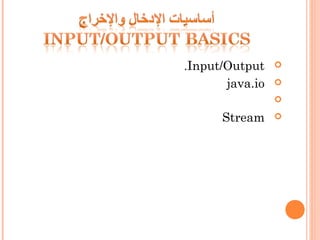 The document discusses Java input/output (I/O) streams. It covers character streams like Reader and Writer, byte streams like InputStream and OutputStream, and file I/O using FileInputStream, FileOutputStream, and RandomAccessFile. Example code is provided to demonstrate reading input from the console, writing to and reading from files, and using seek and getFilePointer methods of RandomAccessFile.
