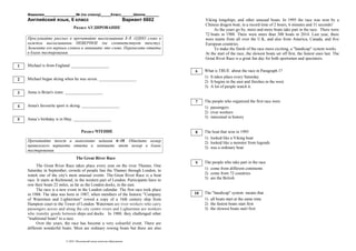 This document appears to be an exam for a 6th grade English class in Russia. It contains sections on listening, reading, vocabulary and grammar, and writing. The listening section provides 5 statements where the student must identify the 1 incorrect word based on a audio passage. The reading comprehension contains a passage about a annual boat race on the River Thames in London and 10 multiple choice questions. The vocabulary and grammar section contains a passage with blanks to be filled and words to be modified. The writing section prompts the student to respond to 4 questions from an English pen pal about animals.