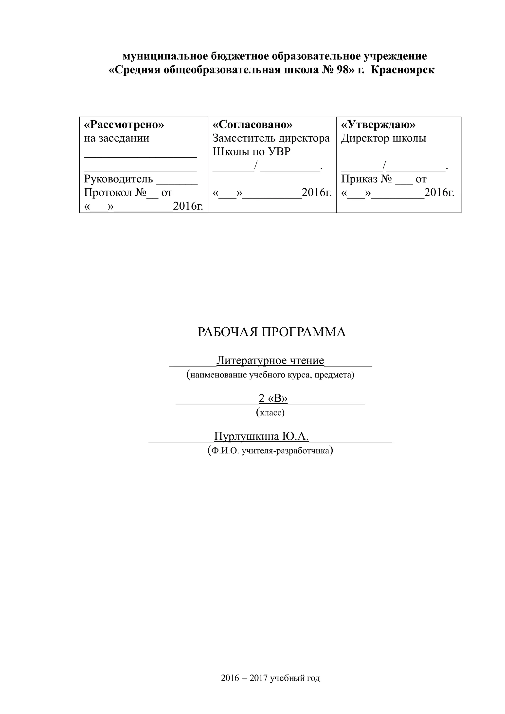 Документ представляет рабочую программу по литературному чтению для 2 класса, сформированную в соответствии с требованиями ФГОС. Она акцентирует внимание на развитии навыков осознанного и выразительного чтения, художественно-творческих способностей и формировании моральных ценностей через художественную литературу. Программа включает разнообразные виды речевой деятельности и обеспечивает условия для формирования читательской компетентности и личностного роста учащихся.