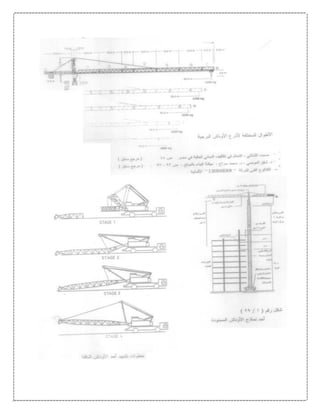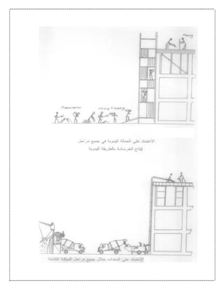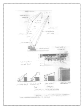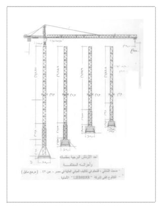 تتناول الوثيقة تطور معدات التشييد عبر التاريخ، بدءًا من الأدوات البدائية التي استخدمها الإنسان منذ القدم، وصولاً إلى المعدات الحديثة المتطورة المستخدمة في المشاريع الإنشائية الكبرى حاليًا. يتم تقسيم المعدات إلى مجموعتين رئيسيتين: الأولى تشمل المعدات المستخدمة في تنفيذ الهياكل، والثانية تشمل المعدات اللازمة لتحريك وإنتاج المواد الإنشائية مثل الخرسانة. كما توضح الوثيقة أهمية هذه المعدات في تحسين جودة وسرعة التنفيذ في المشاريع، مما يعكس تأثيرها المباشر على تكلفة ومدة العمل.