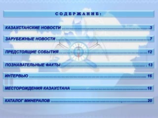 Документ представляет собой еженедельный геологический обзор, который включает в себя новости и события в горнодобывающей отрасли Казахстана и за рубежом, статистические данные и анализ состояния геологии и минеральных ресурсов. Обсуждаются достижения казахстанского электролизного завода, сокращение добычи урана и развитие угольной промышленности в Таджикистане. Также содержатся сведения о планах по модернизации оборудования и улучшению экологических показателей на предприятиях.