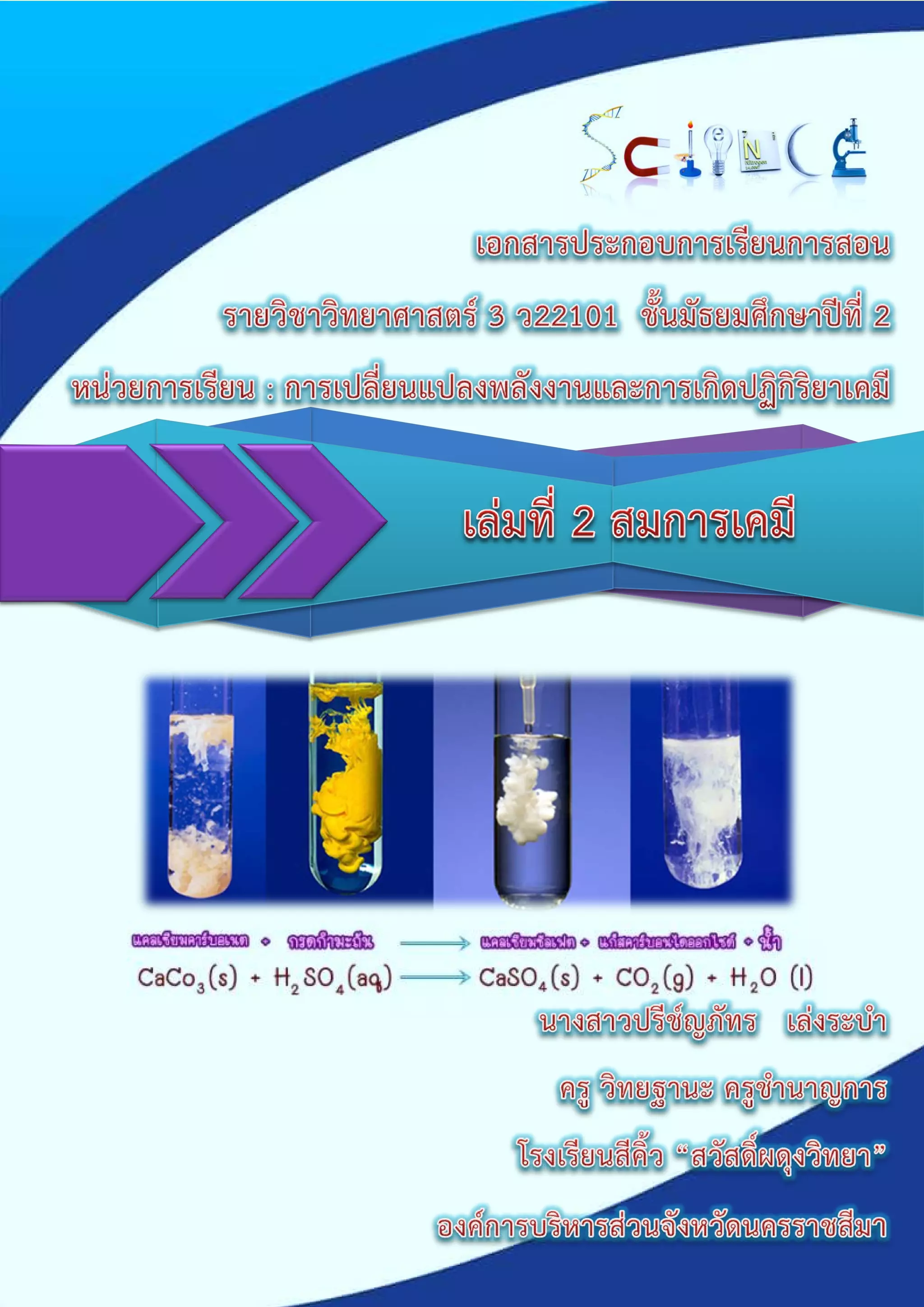 การเปลี่ยนแปลงพลังงานและการเกิดปฏิกิริยาเคมี คานา เอกสารประกอบการจัดกิจกรรมการเรียนรู้แบบวัฏจักรการสืบเสาะหาความรู้ 7 ขั้น เรื่อง การเปลี่ยนแปลงพลังงานและการเกิดปฏิกิริยาเคมี จัดทาขึ้นเพื่อใช้ประกอบการเรียนรู้สาหรับนักเรียน ชั้นมัธยมศึกษาปีที่ 2 โรงเรียนสีคิ้ว “สวัสดิ์ผดุงวิทยา” ซึ่งเอกสารประกอบการจัดการเรียนรู้นี้ มีจานวน 6 เล่ม เล่มที่ 1 เรื่อง การเกิดปฏิกิริยาเคมี เล่มที่ 2 เรื่อง สมการเคมี เล่มที่ 3 เรื่อง มวล พลังงานกับการเกิดปฏิกิริยาเคมี เล่มที่ 4 เรื่อง ปัจจัยที่มีผลต่อการเกิดปฏิกิริยาเคมี เล่มที่ 5 เรื่อง ปฏิกิริยาเคมีในชีวิตประจาวัน เล่มที่ 6 เรื่อง การใช้สารเคมีอย่างถูกต้องปลอดภัย เอกสารประกอบการจัดกิจกรรมการเรียนรู้นี้จัดทาขึ้นเพื่ออานวยความสะดวกให้ครูและนักเรียน สามารถนาไปใช้ในการจัดกิจกรรมการเรียนรู้ประกอบแผนการจัดการเรียนรู้แบบวัฏจักรการสืบเสาะหาความรู้ 7 ขั้น เรื่อง การเปลี่ยนแปลงพลังงานและการเกิดปฏิกิริยาเคมี ในระดับ ชั้นมัธยมศึกษาปีที่ 2 ซึ่งประกอบไป ด้วยแบบทดสอบก่อน - หลังเรียน บันทึกกิจกรรมการทดลอง ใบงานและใบความรู้ ผู้จัดทาหวังเป็นอย่างยิ่งว่า จะเป็นประโยชน์แก่ครูผู้สอน นักเรียนหรือบุคคลที่สนใจทั่วไป ปรีช์ญภัทร เล่งระบา ก