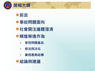 該報告針對國道五號的遊覽車交通事故進行了深入檢討,強調從法規、管理與車輛安全等多方面加強改善措施。自陸客來台觀光後,遊覽車數量激增,市場需求失衡導致安全與服務品質問題嚴重。報告提出22項短、中、長期對策,目前已在積極推進相關執行計畫。