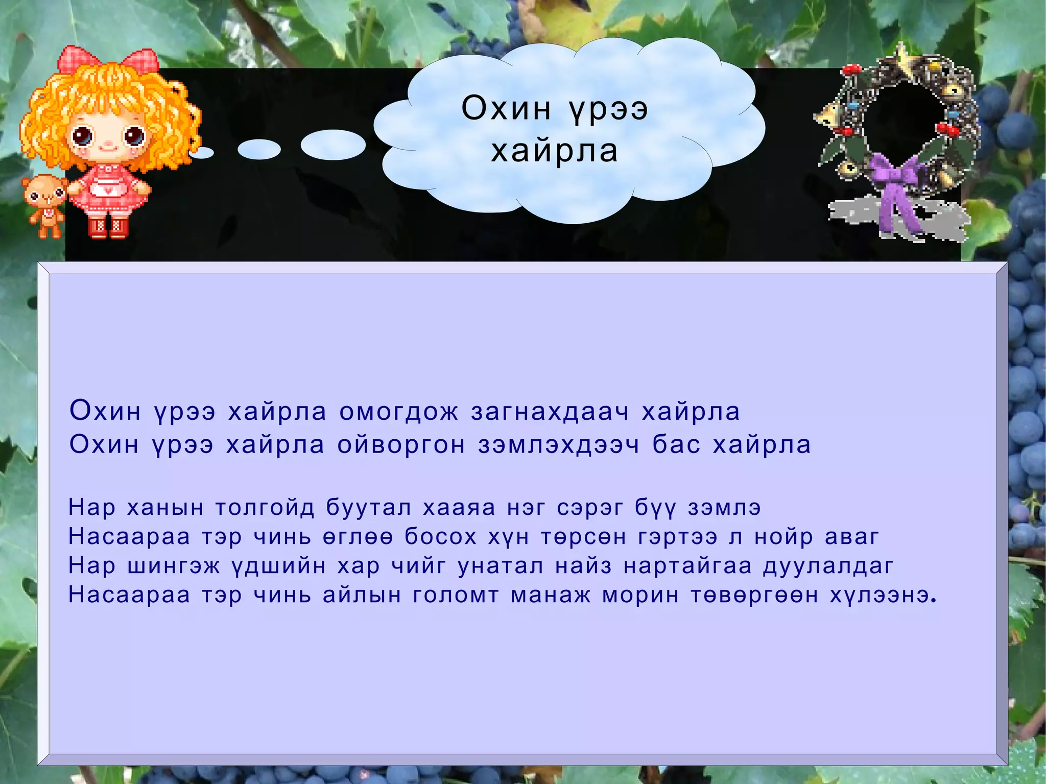 Охин үрээ хайрлаО хин үрээ хайрла омогдож загнахдаач хайрла Охин үрээ хайрла ойворгон зэмлэхдээч бас хайрла Нар ханын толгойд буутал хааяа нэг сэрэг бүү зэмлэ Насаараа тэр чинь өглөө босох хүн төрсөн гэртээ л нойр аваг Нар шингэж үдшийн хар чийг унатал найз нартайгаа дуулалдаг Насаараа тэр чинь айлын голомт манаж морин төвөргөөн хүлээнэ.