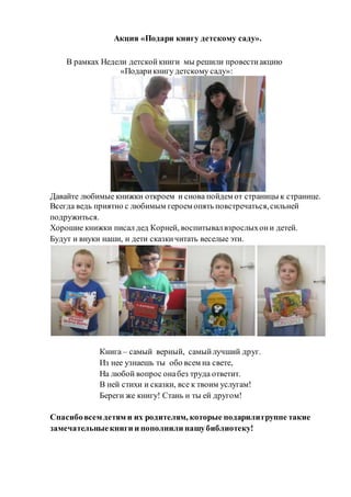 Акция «подари книгу детскому саду» проходит в рамках недели детской книги и направлена на популяризацию чтения среди детей. Участников призывают открыть любимые книжки и делиться ими, подчеркивая важность книг как верного друга и источника знаний. Особая благодарность выражается детям и родителям за подаренные книги, которые пополнят библиотеку детского сада.