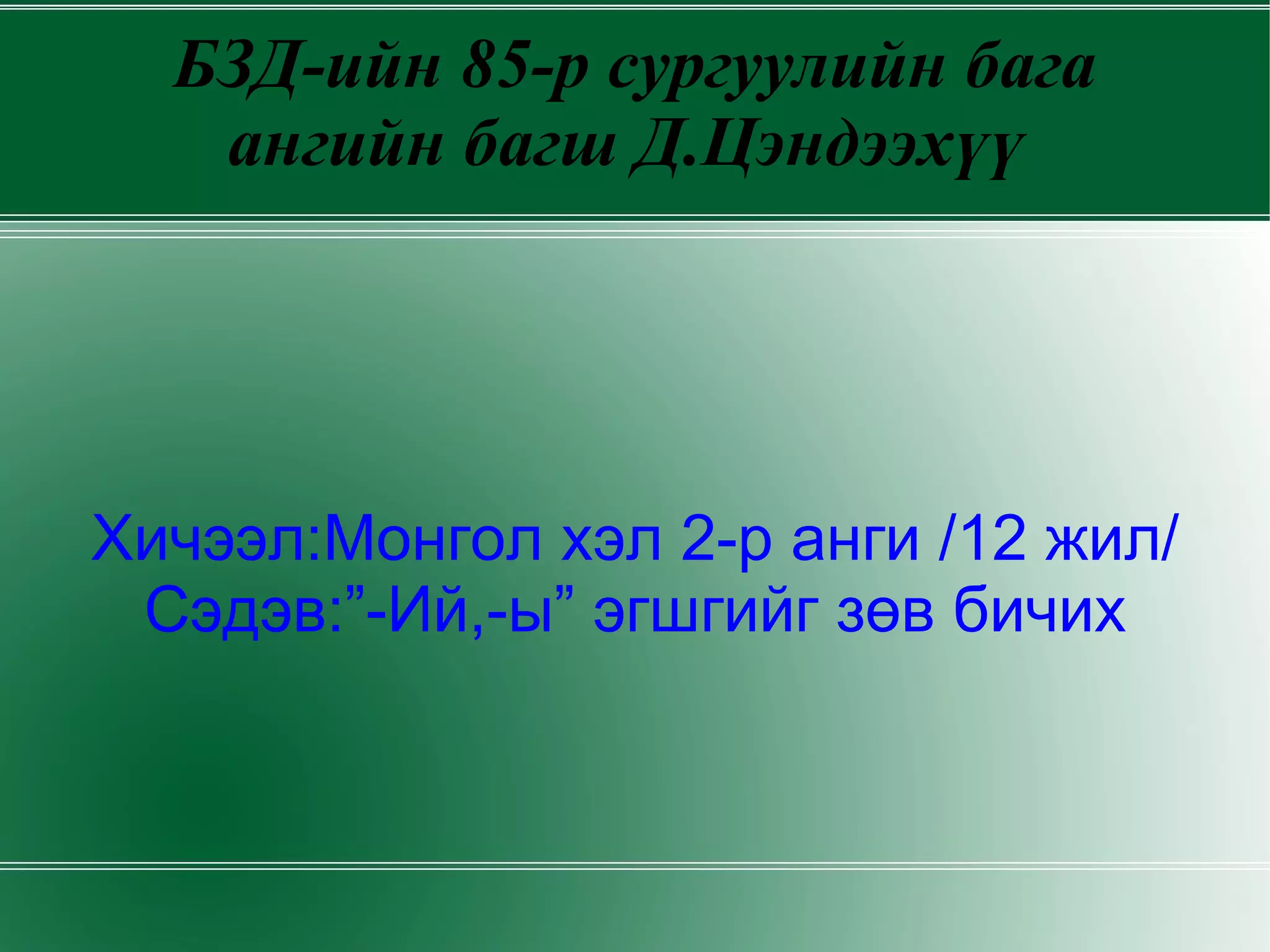 БЗД-ийн 85-р сургуулийнбага ангийн багш Д.Цэндээхүү Хичээл:Монгол хэл 2-р анги /12 жил/ Сэдэв:”-Ий,-ы” эгшгийг зөв бичих - 2.