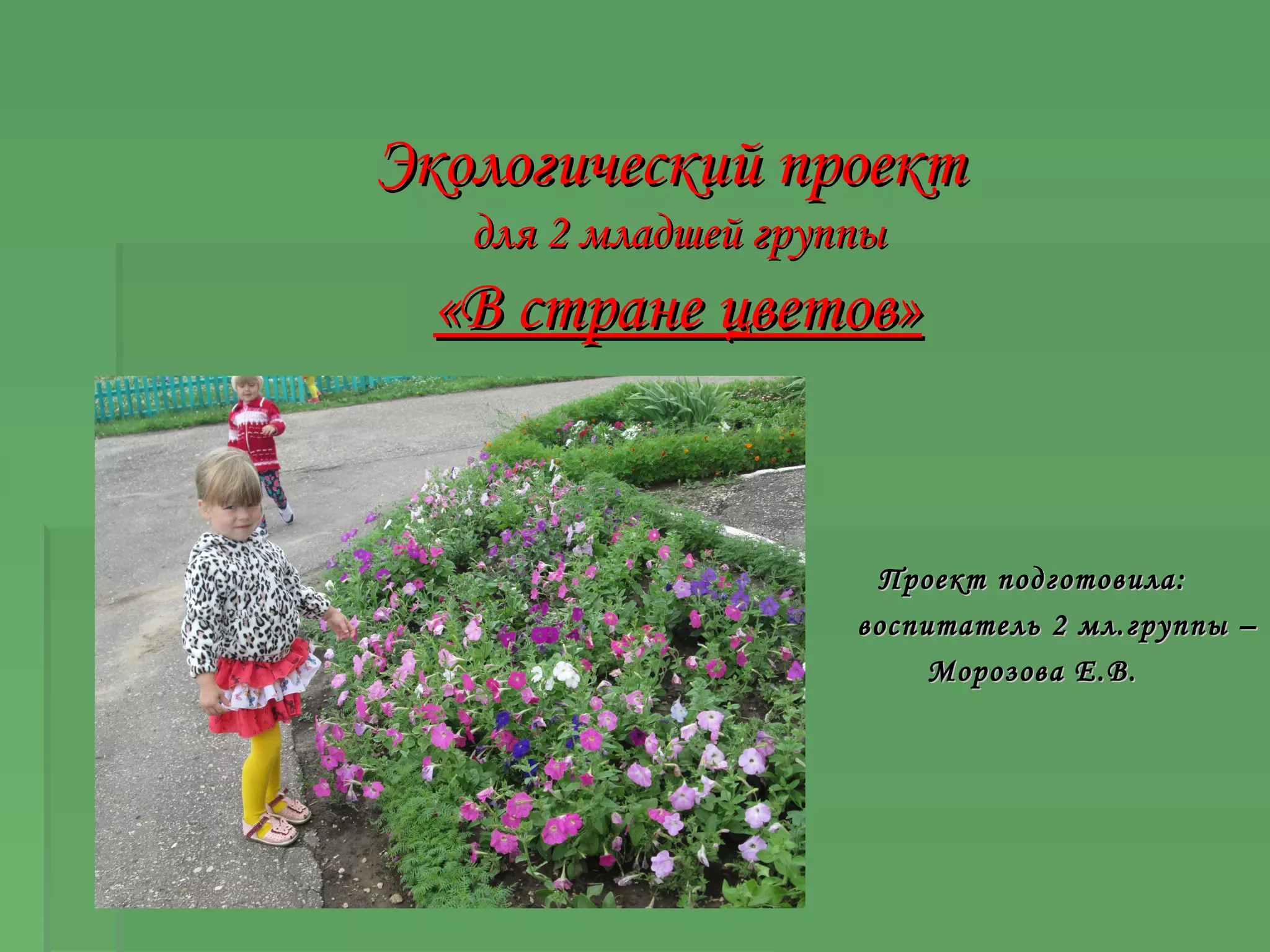 Документ описывает экологический проект для детей младшей группы под названием «в стране цветов», разработанный воспитателем Е.В. Морозовой. Проект включает в себя подготовительные, практические и итоговые этапы, направленные на формирование у детей любви и ответственности к природе через наблюдения, игры и практическую работу. Основные задачи проекта заключаются в развитии экологических понятий и навыков по уходу за растениями.