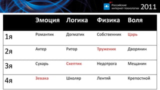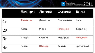 Документ обсуждает типологию личности и влияние психологических функций на отношения, выделяя четыре основные функции: эмоцию, логику, физику и волю. Автор подчеркивает важность понимания психотипов для улучшения взаимодействия и самопонимания, объясняя, как можно определить психотипы людей по их реакциям и поступкам. Также рассматривается, что психотип формируется с рождения и не может быть изменен, но может быть компенсирован или адаптирован через окружение и воспитание.