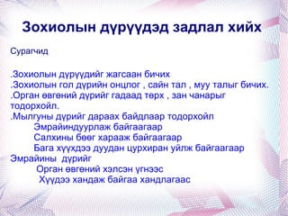 Сурагчид . Зохиолын дүрүүдийг жагсаан бичих .Зохиолын гол дүрийн онцлог , сайн тал , муу талыг бичих. .Орган өвгөний дүрийг гадаад төрх , зан чанарыг тодорхойл. .Мылгуны дүрийг дараах байдлаар тодорхойл Эмрайиндуурлаж байгаагаар Салхины бөөг харааж байгаагаар Бага хүүхдээ дуудан цурхиран уйлж байгаагаар Эмрайины дүрийг Орган өвгөний хэлсэн үгнээс Хүүдээ хандаж байгаа хандлагаас Зохиолын дүрүүдэд задлал хийх - 31.