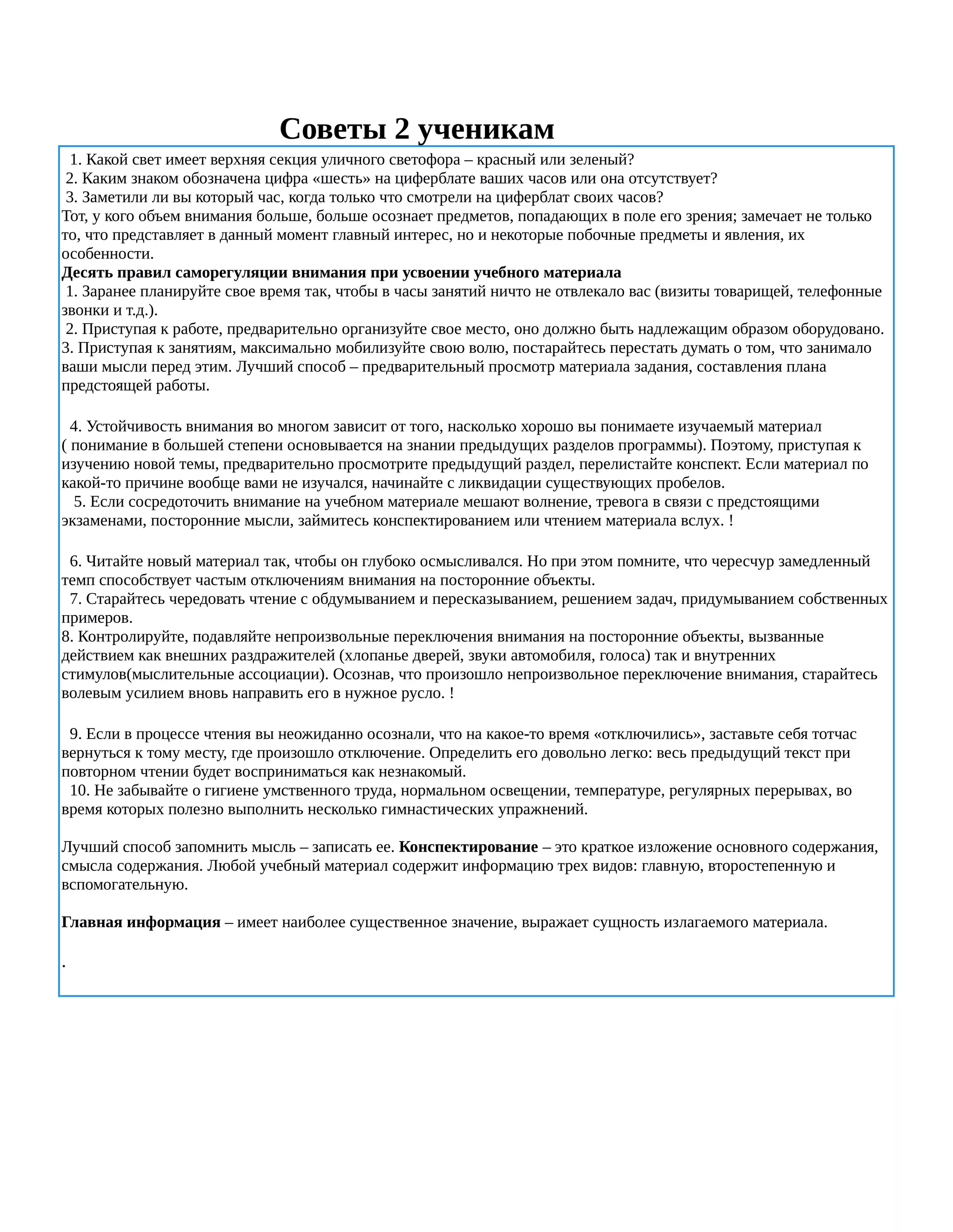 Документ содержит советы для учеников по саморегуляции внимания и эффективному усвоению учебного материала. Он предлагает десять правил, таких как планирование времени, организация рабочего места и использование различных методов для улучшения концентрации. Также подчеркивается важность записи мыслей и осознания структуры учебного материала.