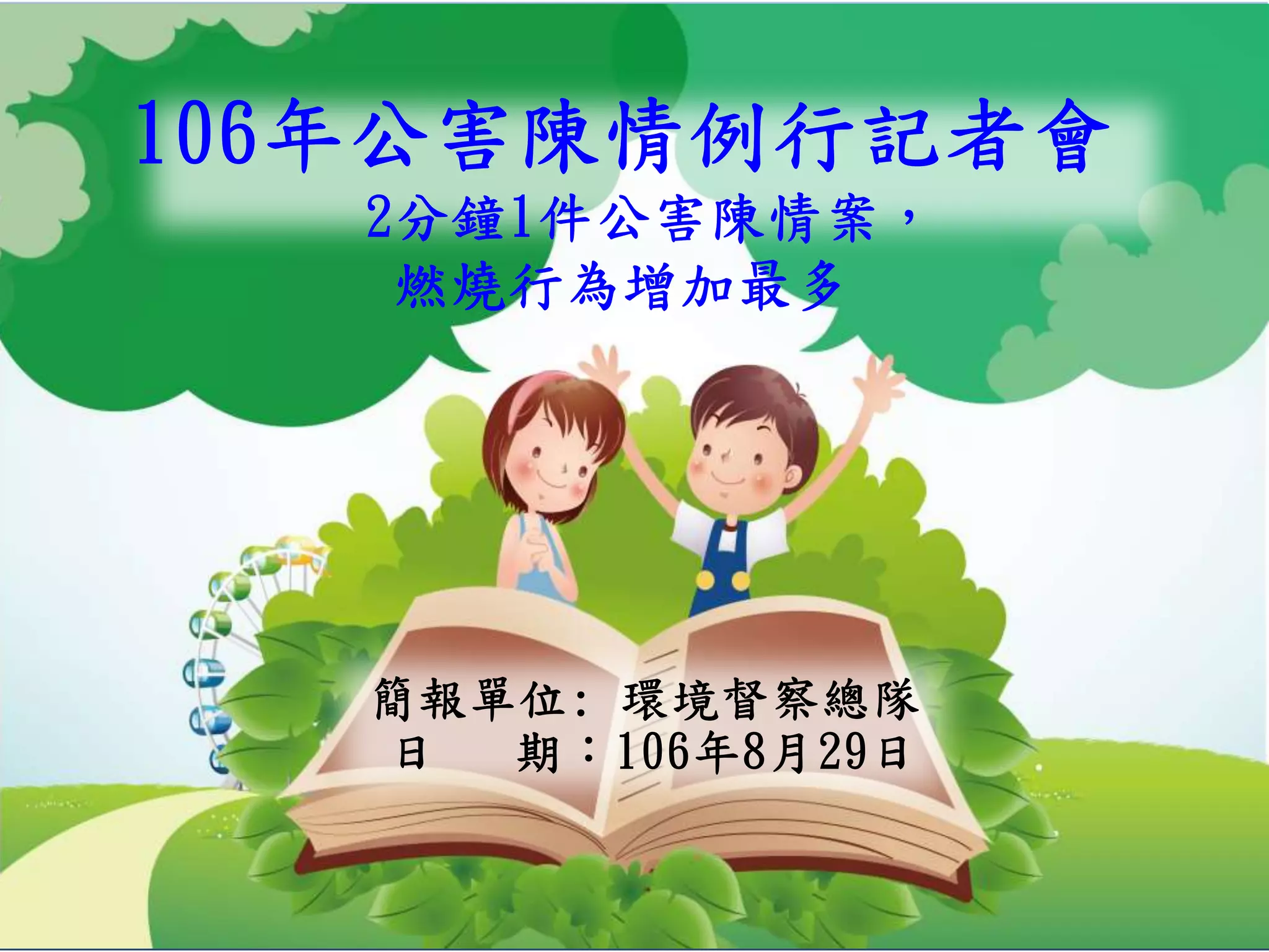 该文档主要包含关于环境污染投诉案件的统计数据和分析,显示过去年度的投诉数量及主要污染类型。它还探讨了针对污染行为的法律惩罚措施以及鼓励公众检举重污染案件的奖金制度。文档结尾呼吁全民环保,并提供了详细的检举方式和联系方式。