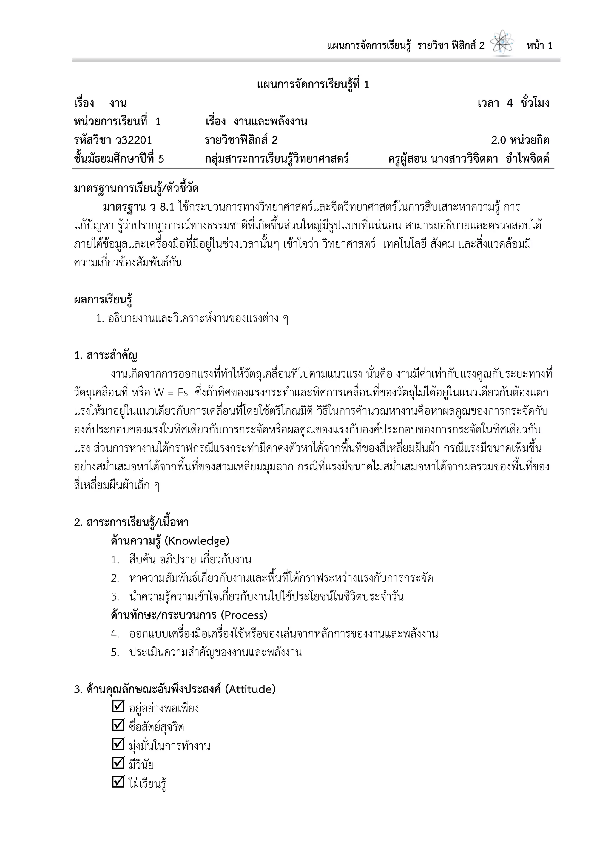 2 หน้า 78 ความสามารถในการคิด ความสามารถในการแก้ปัญหา ความสามารถในการใช้ทักษะชีวิต ความสามารถในการใช้เทคโนโลยี 5. ด้านคุณลักษณะของผู้เรียนตามหลักสูตรมาตรฐานสากล เป็นเลิศวิชาการ 6. บูรณาการตามหลักปรัชญาของเศรษฐกิจพอเพียง 1. หลักความพอประมาณ 1.1 นักเรียนเข้าใจความหมายของทอร์ก 1.2 นักเรียนความรู้ความเข้าใจเกี่ยวกับทอร์กที่กระทาต่อวัตถุ ความสัมพันธ์ของทอร์ก โมเมนต์ ความเฉื่อยและความเร่งเชิงมุม ความสัมพันธ์ของโมเมนตัมความเฉื่อยกับมวลของวัตถุและระยทางกาลังสองที่มวล ย่อยห่างจากแกนหมุนได้ 2. หลักความมีเหตุผล 2.1 รู้จักใช้เหตุผลในการวางแผนและออกแบบวิธีการหาคาตอบในแบบฝึกหัดเรื่อง ทอร์กกับการ เคลื่อนที่แบบหมุน 2.2 นักเรียนมีความรู้เรื่อง ทอร์กกับการเคลื่อนที่แบบหมุน โมเมนต์ความเฉื่อยและความเร่งเชิงมุม มาคานวณหาปริมาณต่างๆ ในการเคลื่อนที่แบบหมุนเมื่อกาหนดสถานการณ์ให้ 3. หลักภูมิคุ้มกัน 3.1 ตระหนักถึงความเปลี่ยนแปลงต่างๆที่เกิดขึ้นในชีวิตประจาวัน 3.2 เรียนรู้ปริมาณที่ต่างๆที่เกี่ยวข้องกับทอร์ก โมเมนต์ความเฉื่อน และการเคลื่อนที่แบบหมุน 4. เงื่อนไขความรู้ 4.1 รอบรู้เกี่ยวกับความสัมพันธ์ของปริมาณที่เกี่ยวข้องกับการกระจัดเชิงมุม ความเร็วเชิงมุม ความเร่งเชิงมุมเวลา ทอร์กที่กระทาต่อวัตถุ ความสัมพันธ์ของทอร์ก โมเมนต์ความเฉื่อยและความเร่งเชิงมุม เชื่อมโยงความรู้ไปสู่เรื่อง การเคลื่อนที่แบบหมุน ความสัมพันธ์ของโมเมนตัมความเฉื่อยกับมวลของวัตถุและระ ยทางกาลังสองที่มวลย่อยห่างจากแกนหมุน 4.2 รอบคอบในการใช้ทรัพยากรต่างๆอย่างมีประสิทธิภาพ เช่น สมุด ใบงาน เครื่องเขียน 5. เงื่อนไขคุณธรรม ใช้หลักคุณธรรม 8 ประการ ดังนี้ 5.1 มีความขยัน ตั้งใจศึกษาหาความรู้ในเรื่องเรียน 5.2 ใช้ทรัพยากรที่มีอยู่อย่างประหยัด เช่น เอกสารใบงาน อุปกรณ์เครื่องเขียน 5.3 ซื่อสัตย์ทั้งต่อตนเองและผู้อื่นในการทาใบงาน แบบฝึกหัดและการบ้านด้วยตนเอง 5.4 มีวินัยในการปฏิบัติตามคาแนะนาในการทดลองอย่างเคร่งครัด 5.5 มีความสุภาพในการซักถามคาถาม และการแลกเปลี่ยนข้อคิดเห็นกับเพื่อนและครู 5.6 รักษาความสะอาดของตนเอง ห้องเรียน และอุปกรณ์ที่ใช้ในการทดลอง 5.7 มีความสามัคคีในหมู่คณะที่ร่วมมือกันปฏิบัติการทดลองตามกิจกรรมที่ได้รับ 5.8 มีน้าใจช่วยเหลือกันภายในกลุ่มในการให้ความปรึกษา ช่วยกันทากิจกรรม ทาความสะอาดโต๊ะ และพื้นที่จัดกิจกรรม