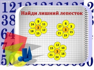 Документ содержит задания и упражнения на математику для детей, включая продолжение числовых рядов, нахождение лишних чисел и лепестков, а также решение задач на сложение и умножение. Также представлены практические примеры из жизни, такие как задача о бананах и клубнике, для использования в обучении. В документе есть разделы, посвященные самопроверке и совместной работе в паре.