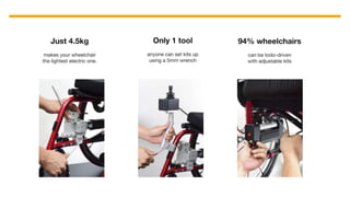 기존의 수동휠체어에간단한 키트를 장착해서 전동휠체어로도 사용할 수 있습니다