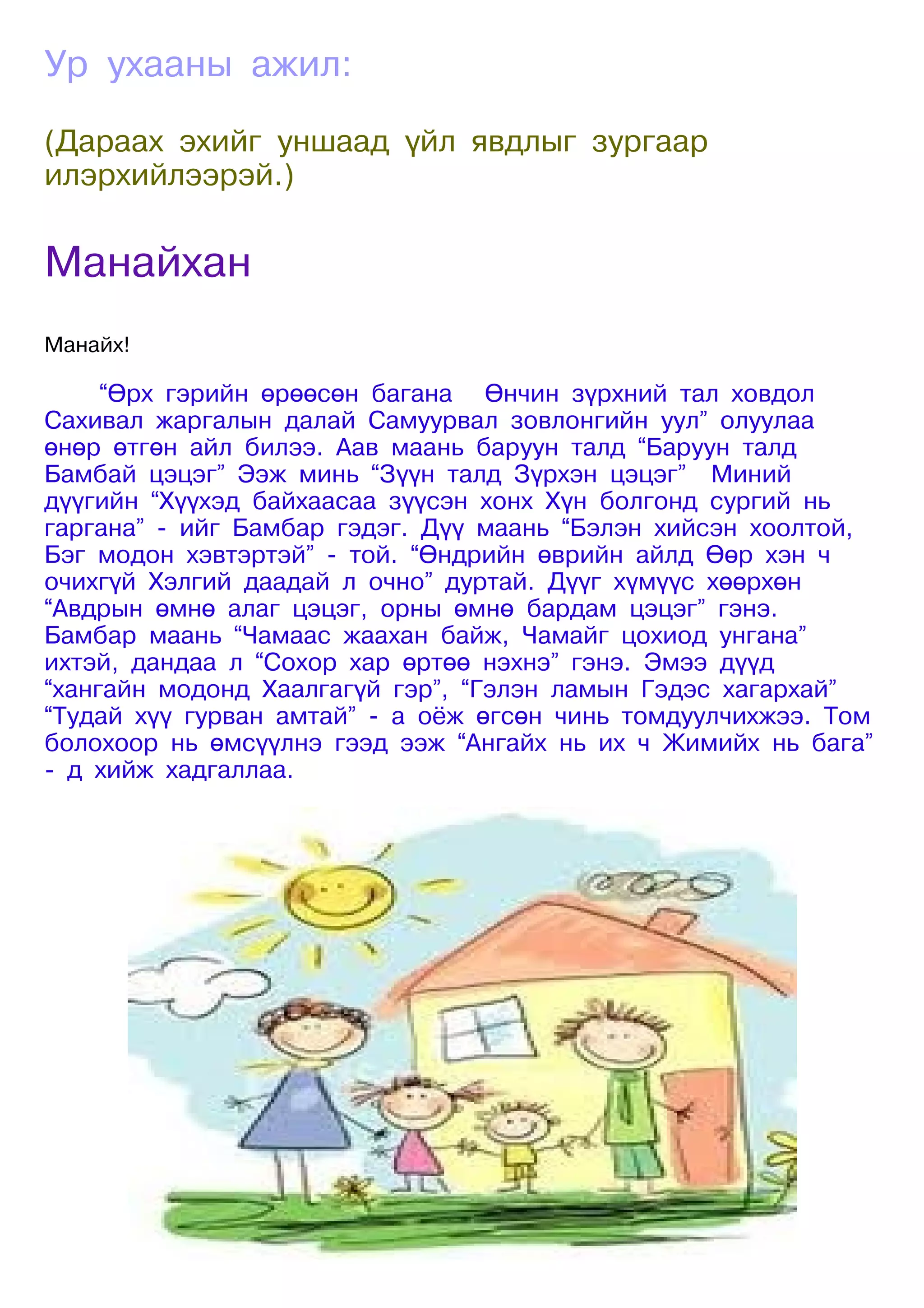 эхийг уншаад үйл явдлыг зургаар илэрхийлээрэй.) Манайхан Манайх! “Өрх гэрийн өрөөсөн багана Өнчин зүрхний тал ховдол Сахивал жаргалын далай Самуурвал зовлонгийн уул” олуулаа өнөр өтгөн айл билээ. Аав маань баруун талд “Баруун талд Бамбай цэцэг” Ээж минь “Зүүн талд Зүрхэн цэцэг” Миний дүүгийн “Хүүхэд байхаасаа зүүсэн хонх Хүн болгонд сургий нь гаргана” - ийг Бамбар гэдэг. Дүү маань “Бэлэн хийсэн хоолтой, Бэг модон хэвтэртэй” - той. “Өндрийн өврийн айлд Өөр хэн ч очихгүй Хэлгий даадай л очно” дуртай. Дүүг хүмүүс хөөрхөн “Авдрын өмнө алаг цэцэг, орны өмнө бардам цэцэг” гэнэ. Бамбар маань “Чамаас жаахан байж, Чамайг цохиод унгана” ихтэй, дандаа л “Сохор хар өртөө нэхнэ” гэнэ. Эмээ дүүд “хангайн модонд Хаалгагүй гэр”, “Гэлэн ламын Гэдэс хагархай” “Тудай хүү гурван амтай” - а оёж өгсөн чинь томдуулчихжээ. Том болохоор нь өмсүүлнэ гээд ээж “Ангайх нь их ч Жимийх нь бага” - д хийж хадгаллаа.